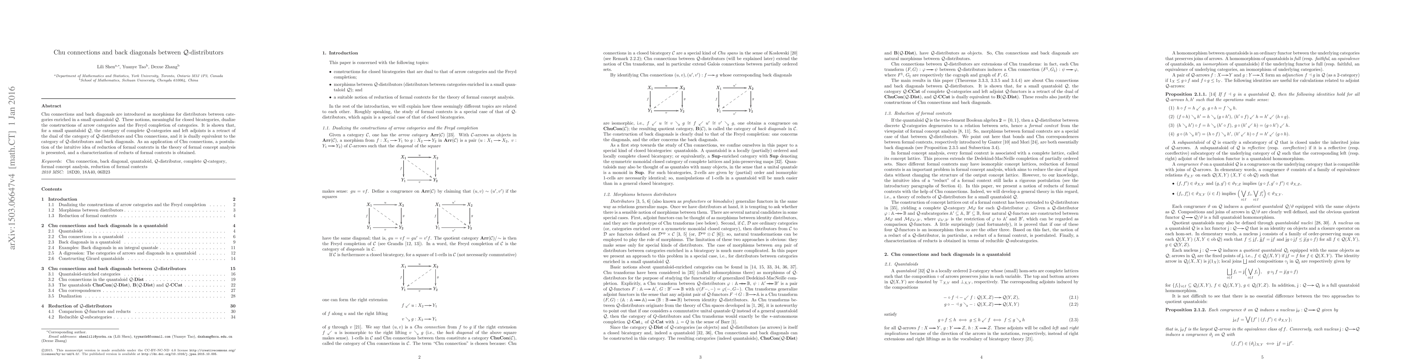 The research introduces Chu connections and back diagonals as morphisms for distributors between categories enriched in a small quantaloid Q, dualizing arrow categories and the Freyd completion of categories. It establishes that for a small quantaloid Q, the category of complete Q-categories and left adjoints is a retract of the dual of the category of Q-distributors and Chu connections, and it is dually equivalent to the category of Q-distributors and back diagonals.