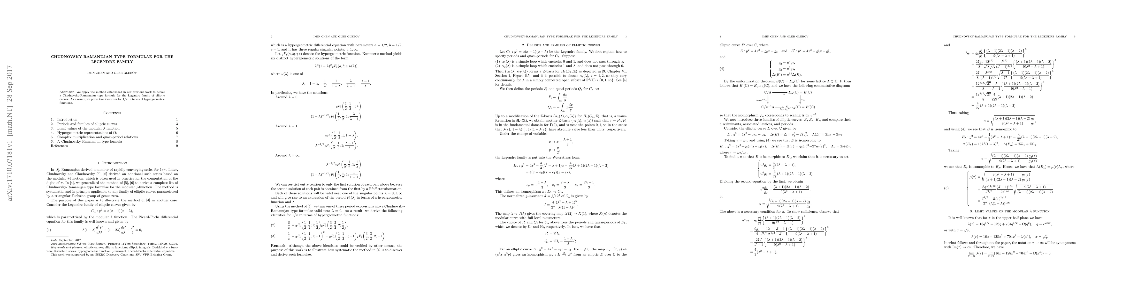 The paper derives a Chudnovsky-Ramanujan type formula for the Legendre family of elliptic curves, resulting in two new identities for $1/\pi$ expressed through hypergeometric functions.