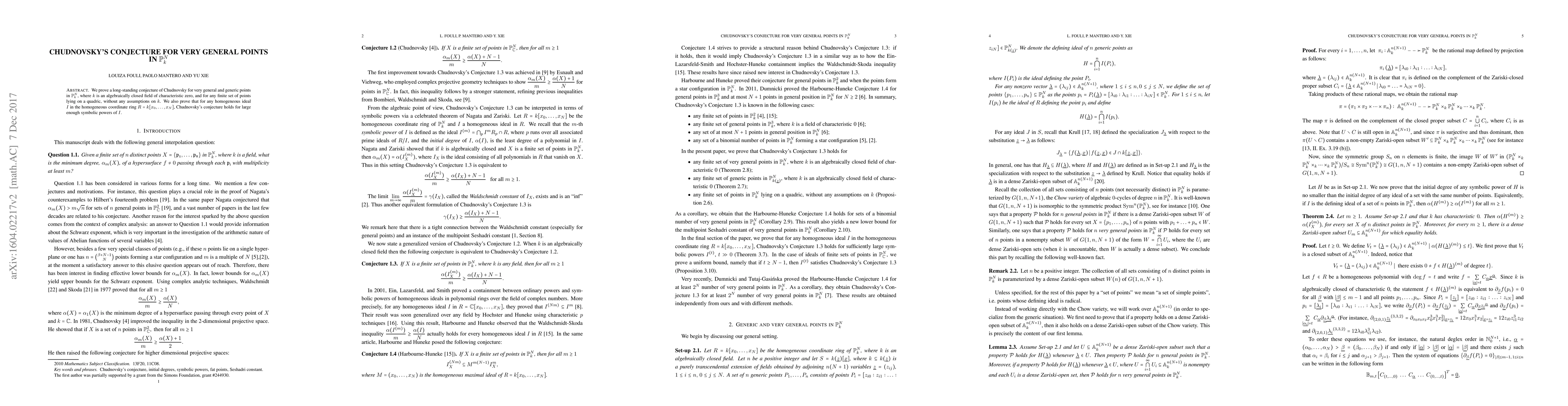We prove a long-standing conjecture of Chudnovsky for very general and generic points in $\mathbb{P}_k^N$, where $k$ is an algebraically closed field of characteristic zero, and for any finite set of points lying on a quadric, without any assumptions on $k$. We also prove that for any homogeneous ideal $I$ in the homogeneous coordinate ring $R=k[x_0, \ldots, x_N]$, Chudnovsky's conjecture holds for large enough symbolic powers of $I$.