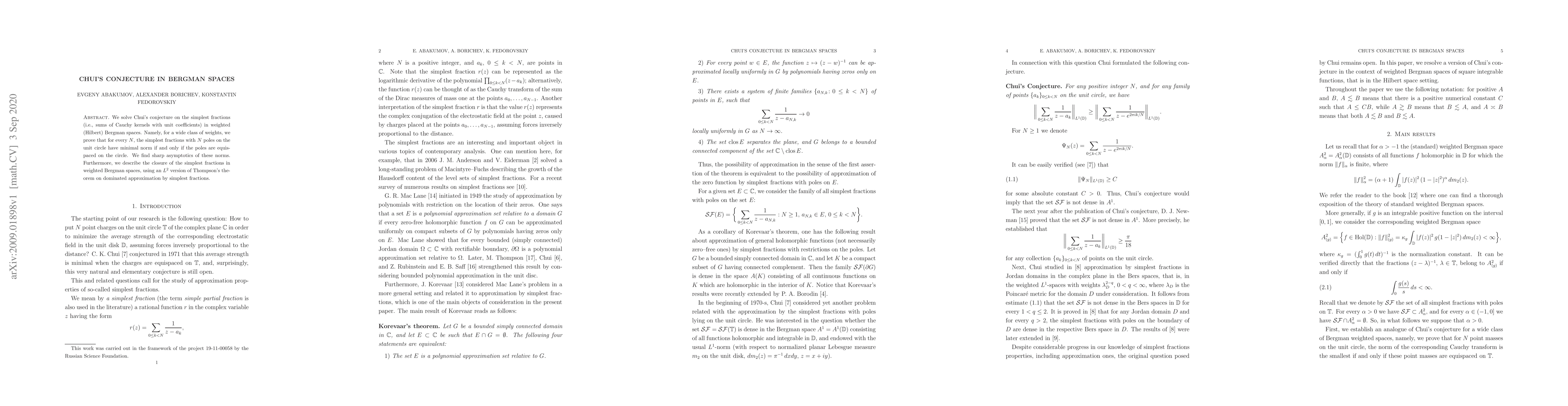 We solve Chui's conjecture on the simplest fractions (i.e., sums of Cauchy kernels with unit coefficients) in weighted (Hilbert) Bergman spaces. Namely, for a wide class of weights, we prove that for every $N$, the simplest fractions with $N$ poles on the unit circle have minimal norm if and only if the poles are equispaced on the circle. We find sharp asymptotics of these norms. Furthermore, we describe the closure of the simplest fractions in weighted Bergman spaces, using an $L^2$ version of Thompson's theorem on dominated approximation by simplest fractions.