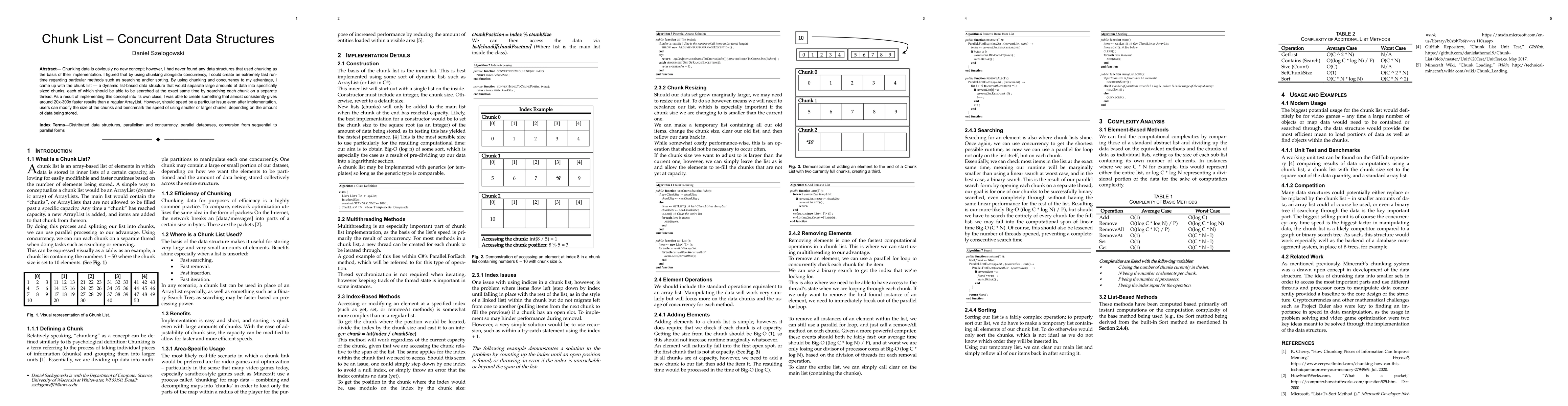 Chunking data is obviously no new concept; however, I had never found any data structures that used chunking as the basis of their implementation. I figured that by using chunking alongside concurrency, I could create an extremely fast run-time in regards to particular methods as searching and/or sorting. By using chunking and concurrency to my advantage, I came up with the chunk list - a dynamic list-based data structure that would separate large amounts of data into specifically sized chunks, each of which should be able to be searched at the exact same time by searching each chunk on a separate thread. As a result of implementing this concept into its own class, I was able to create something that almost consistently gives around 20x-300x faster results than a regular ArrayList. However, should speed be a particular issue even after implementation, users can modify the size of the chunks and benchmark the speed of using smaller or larger chunks, depending on the amount of data being stored.
