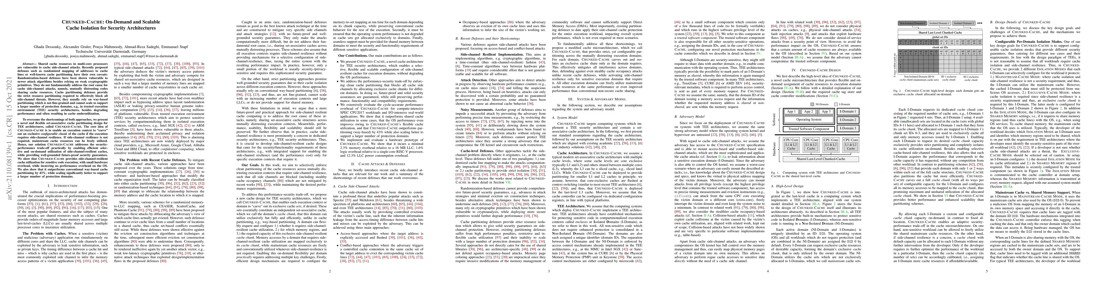 Chunked-Cache presents a novel cache partitioning design for multi-core processors to mitigate cache side-channel attacks by enabling on-demand, scalable, and fine-grained cache isolation. It outperforms traditional way-based partitioning by 43% and scales better for numerous protection domains without performance overhead.
