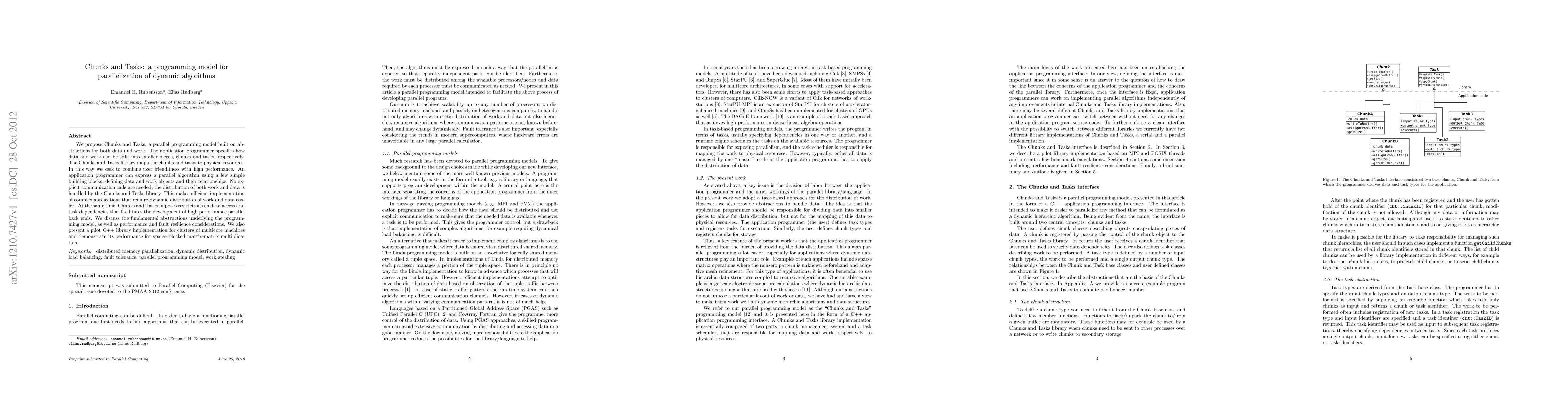 The paper introduces Chunks and Tasks, a parallel programming model that simplifies dynamic algorithm parallelization by abstracting data and work into chunks and tasks, respectively. The model aims to balance user-friendliness and high performance, facilitating efficient implementation without explicit communication calls.