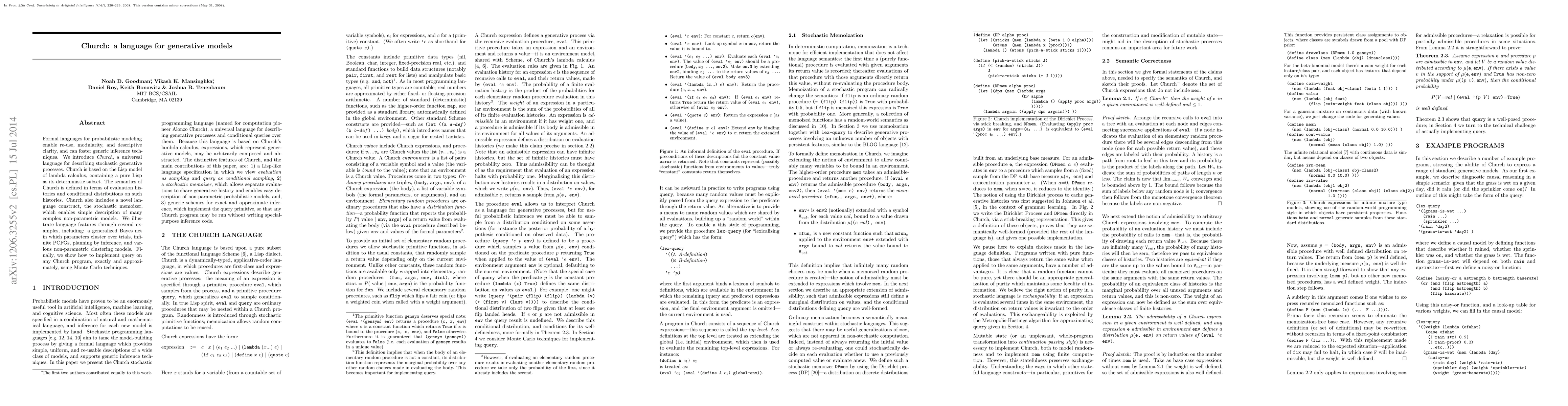 Church is a universal language for describing stochastic generative processes, based on lambda calculus, featuring a stochastic memoizer for complex non-parametric models, and enabling exact and approximate query implementations via Monte Carlo techniques. It illustrates its capabilities through examples like clustered Bayes nets, infinite PCFGs, and non-parametric clustering.