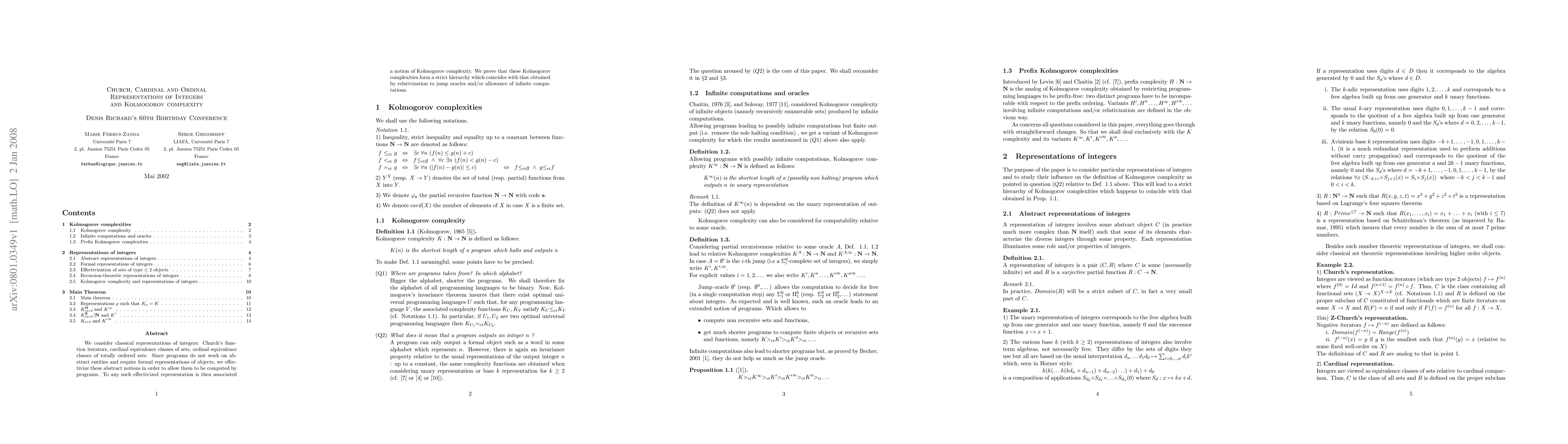 This paper examines classical integer representations—Church iterators, cardinal equivalence classes, and ordinal equivalence classes—and their effectivization for computational use. It associates each effectivized representation with a Kolmogorov complexity, proving a strict hierarchy among these complexities that aligns with relativization to jump oracles and infinite computations.