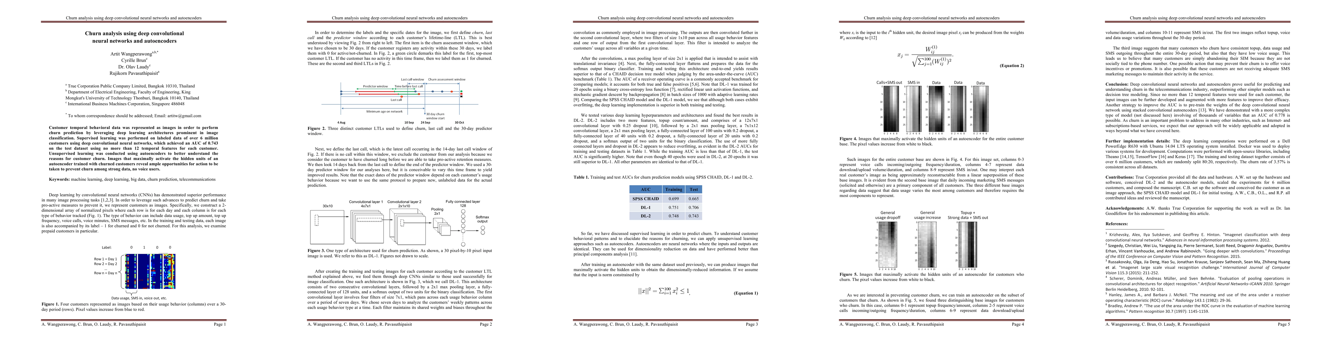 This study employs deep convolutional neural networks to predict customer churn using temporal behavioral data represented as images, achieving an AUC of 0.743. Autoencoders were used in an unsupervised manner to uncover insights into churn reasons, highlighting actionable opportunities for preventing churn among specific user groups.