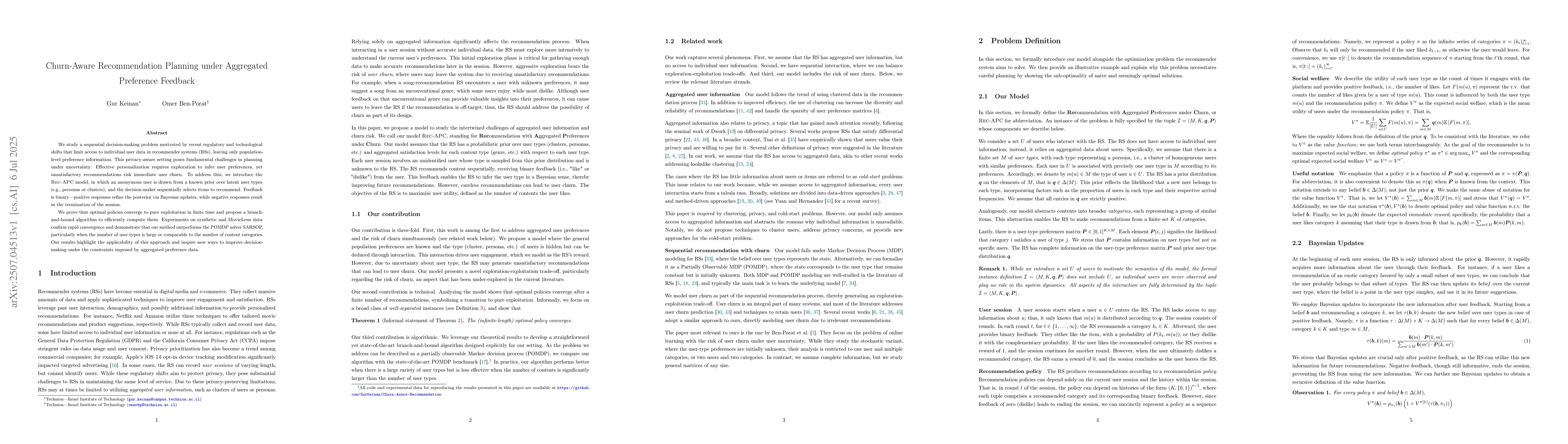 We study a sequential decision-making problem motivated by recent regulatory and technological shifts that limit access to individual user data in recommender systems (RSs), leaving only population-level preference information. This privacy-aware setting poses fundamental challenges in planning under uncertainty: Effective personalization requires exploration to infer user preferences, yet unsatisfactory recommendations risk immediate user churn. To address this, we introduce the Rec-APC model, in which an anonymous user is drawn from a known prior over latent user types (e.g., personas or clusters), and the decision-maker sequentially selects items to recommend. Feedback is binary -- positive responses refine the posterior via Bayesian updates, while negative responses result in the termination of the session. We prove that optimal policies converge to pure exploitation in finite time and propose a branch-and-bound algorithm to efficiently compute them. Experiments on synthetic and MovieLens data confirm rapid convergence and demonstrate that our method outperforms the POMDP solver SARSOP, particularly when the number of user types is large or comparable to the number of content categories. Our results highlight the applicability of this approach and inspire new ways to improve decision-making under the constraints imposed by aggregated preference data.