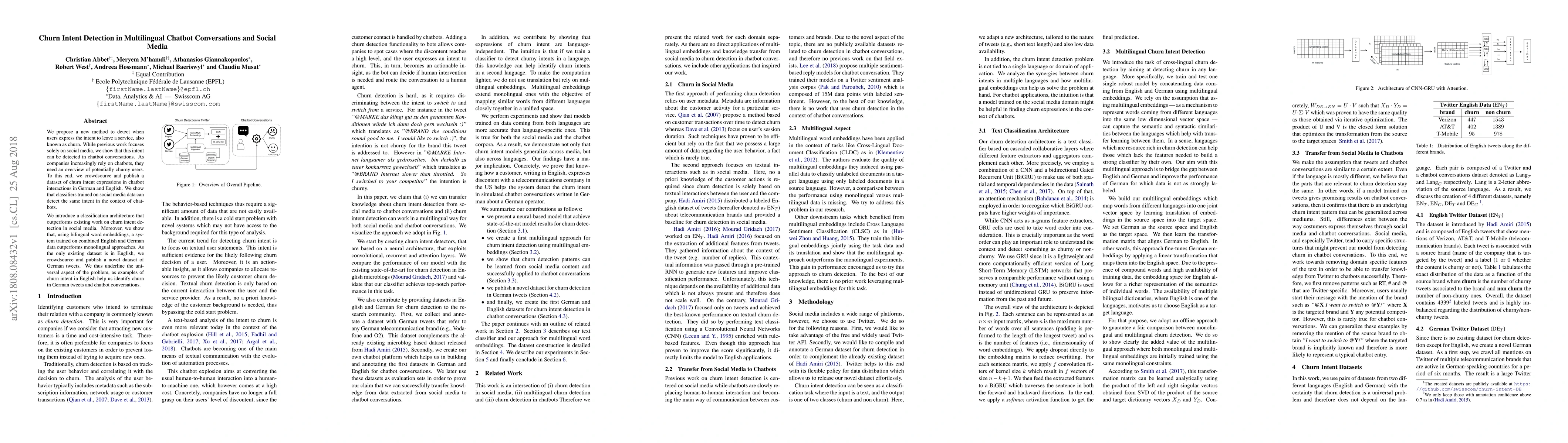 This paper proposes a method to detect churn intent in multilingual chatbot conversations and social media, introducing a new dataset of churn expressions in chatbot interactions in German and English. The study demonstrates that classifiers trained on social media data can also identify churn intent in chatbots, and that a bilingual word embedding approach outperforms monolingual methods.