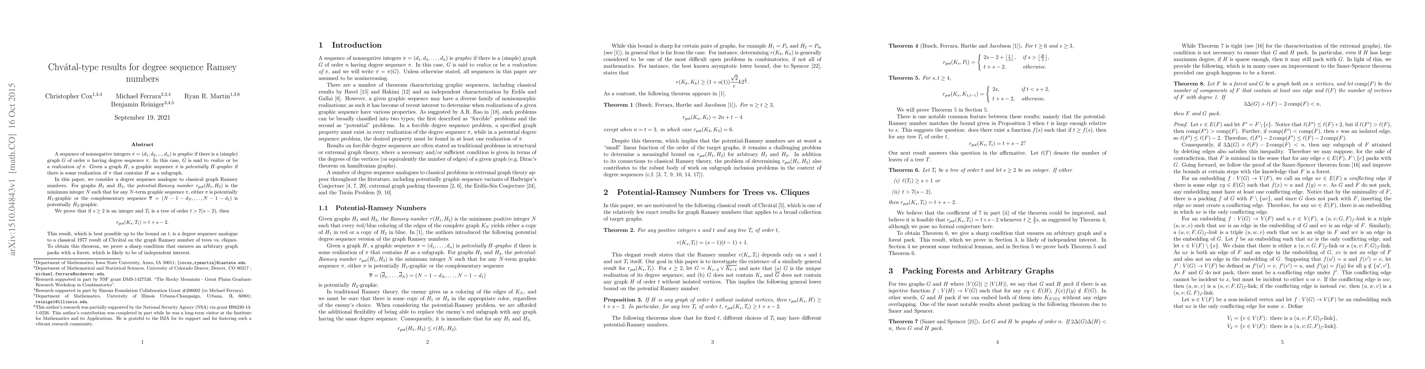 A sequence of nonnegative integers $\pi =(d_1,d_2,...,d_n)$ is graphic if there is a (simple) graph $G$ of order $n$ having degree sequence $\pi$. In this case, $G$ is said to realize or be a realization of $\pi$. Given a graph $H$, a graphic sequence $\pi$ is potentially $H$-graphic if there is some realization of $\pi$ that contains $H$ as a subgraph. In this paper, we consider a degree sequence analogue to classical graph Ramsey numbers. For graphs $H_1$ and $H_2$, the potential-Ramsey number $r_{pot}(H_1,H_2)$ is the minimum integer $N$ such that for any $N$-term graphic sequence $\pi$, either $\pi$ is potentially $H_1$-graphic or the complementary sequence $\overline{\pi}=(N-1-d_N,\dots, N-1-d_1)$ is potentially $H_2$-graphic. We prove that if $s\ge 2$ is an integer and $T_t$ is a tree of order $t> 7(s-2)$, then $$r_{pot}(K_s, T_t) = t+s-2.$$ This result, which is best possible up to the bound on $t$, is a degree sequence analogue to a classical 1977 result of Chv\'{a}tal on the graph Ramsey number of trees vs. cliques. To obtain this theorem, we prove a sharp condition that ensures an arbitrary graph packs with a forest, which is likely to be of independent interest.