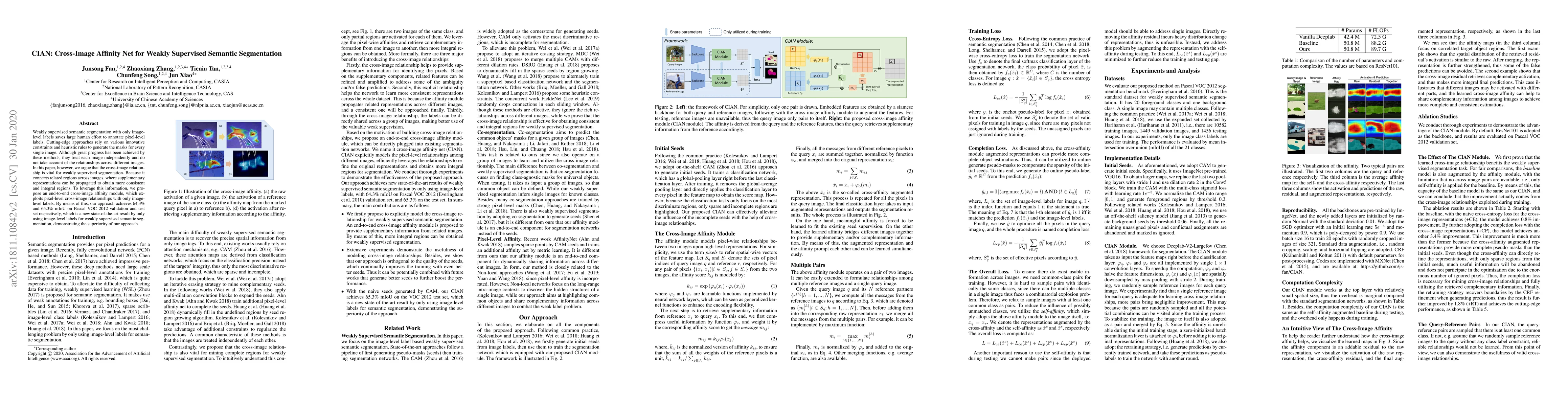 This paper introduces a Cross-Image Affinity Net (CIAN) for weakly supervised semantic segmentation, leveraging cross-image relationships to improve segmentation consistency. The proposed module achieves state-of-the-art results on Pascal VOC 2012 with 64.3% and 65.3% mIoU on validation and test sets, respectively.