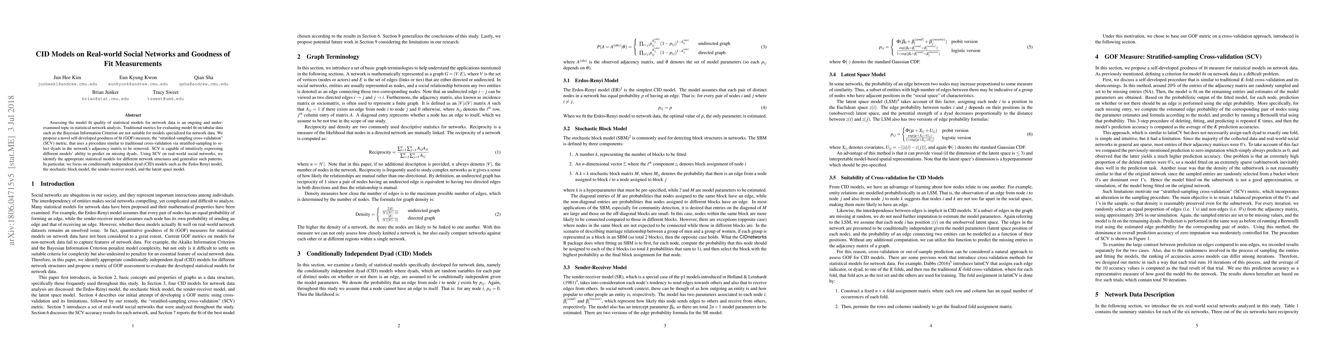 Assessing the model fit quality of statistical models for network data is an ongoing and under-examined topic in statistical network analysis. Traditional metrics for evaluating model fit on tabular data such as the Bayesian Information Criterion are not suitable for models specialized for network data. We propose a novel self-developed goodness of fit (GOF) measure, the `stratified-sampling cross-validation' (SCV) metric, that uses a procedure similar to traditional cross-validation via stratified-sampling to select dyads in the network's adjacency matrix to be removed. SCV is capable of intuitively expressing different models' ability to predict on missing dyads. Using SCV on real-world social networks, we identify the appropriate statistical models for different network structures and generalize such patterns. In particular, we focus on conditionally independent dyad (CID) models such as the Erdos Renyi model, the stochastic block model, the sender-receiver model, and the latent space model.