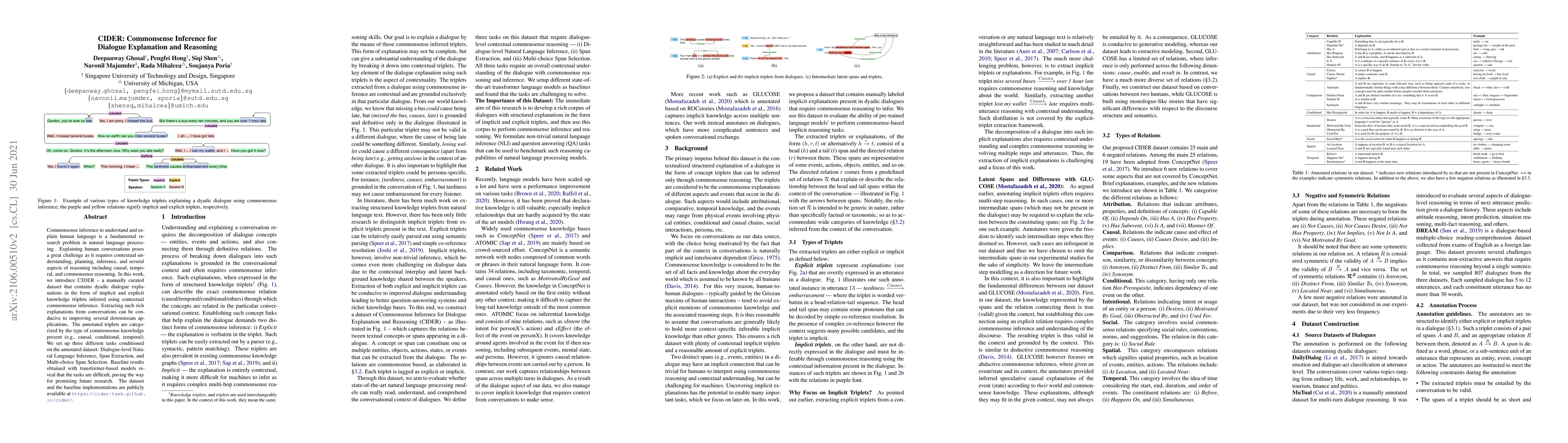 Commonsense inference to understand and explain human language is a fundamental research problem in natural language processing. Explaining human conversations poses a great challenge as it requires contextual understanding, planning, inference, and several aspects of reasoning including causal, temporal, and commonsense reasoning. In this work, we introduce CIDER -- a manually curated dataset that contains dyadic dialogue explanations in the form of implicit and explicit knowledge triplets inferred using contextual commonsense inference. Extracting such rich explanations from conversations can be conducive to improving several downstream applications. The annotated triplets are categorized by the type of commonsense knowledge present (e.g., causal, conditional, temporal). We set up three different tasks conditioned on the annotated dataset: Dialogue-level Natural Language Inference, Span Extraction, and Multi-choice Span Selection. Baseline results obtained with transformer-based models reveal that the tasks are difficult, paving the way for promising future research. The dataset and the baseline implementations are publicly available at https://cider-task.github.io/cider/.