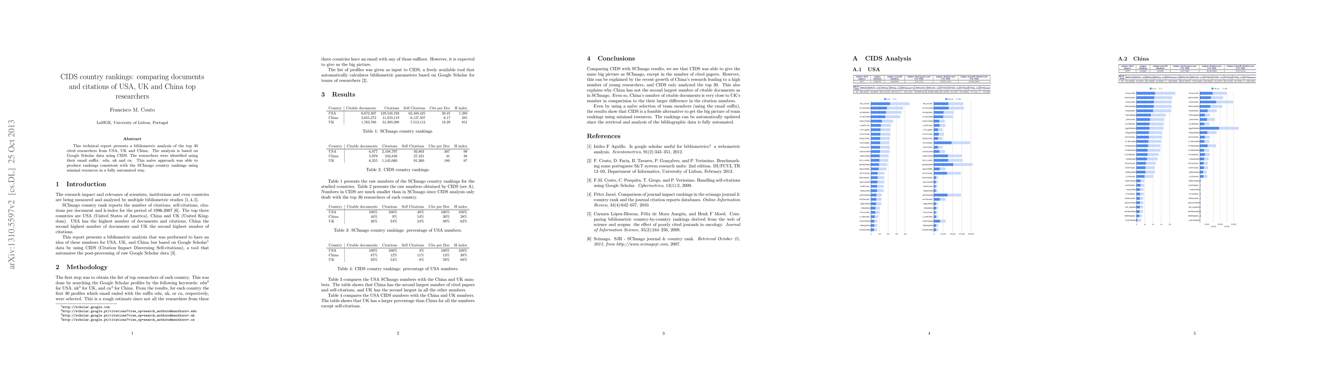This technical report presents a bibliometric analysis of the top 30 cited researchers from USA, UK and China. The analysis is based on Google Scholar data using CIDS. The researchers were identified using their email suffix: edu, uk and cn. This na\"{i}ve approach was able to produce rankings consistent with the SCImago country rankings using mininal resources in a fully automated way.