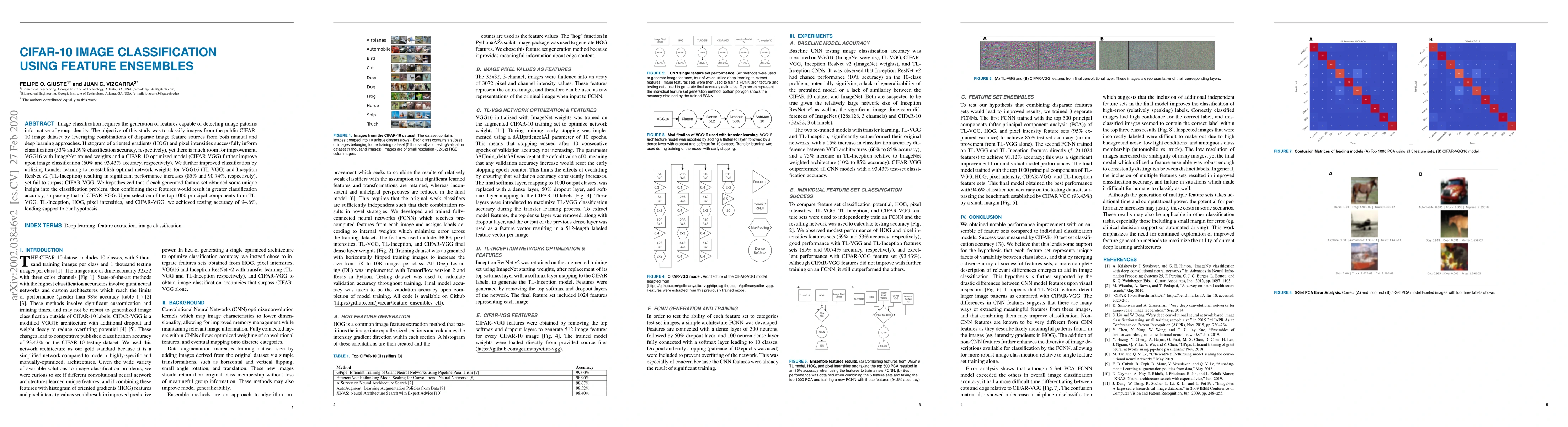 Image classification requires the generation of features capable of detecting image patterns informative of group identity. The objective of this study was to classify images from the public CIFAR-10 image dataset by leveraging combinations of disparate image feature sources from both manual and deep learning approaches. Histogram of oriented gradients (HOG) and pixel intensities successfully inform classification (53% and 59% classification accuracy, respectively), yet there is much room for improvement. VGG16 with ImageNet trained weights and a CIFAR-10 optimized model (CIFAR-VGG) further improve upon image classification (60% and 93.43% accuracy, respectively). We further improved classification by utilizing transfer learning to re-establish optimal network weights for VGG16 (TL-VGG) and Inception ResNet v2 (TL-Inception) resulting in significant performance increases (85% and 90.74%, respectively), yet fail to surpass CIFAR-VGG. We hypothesized that if each generated feature set obtained some unique insight into the classification problem, then combining these features would result in greater classification accuracy, surpassing that of CIFAR-VGG. Upon selection of the top 1000 principal components from TL-VGG, TL-Inception, HOG, pixel intensities, and CIFAR-VGG, we achieved testing accuracy of 94.6%, lending support to our hypothesis.
