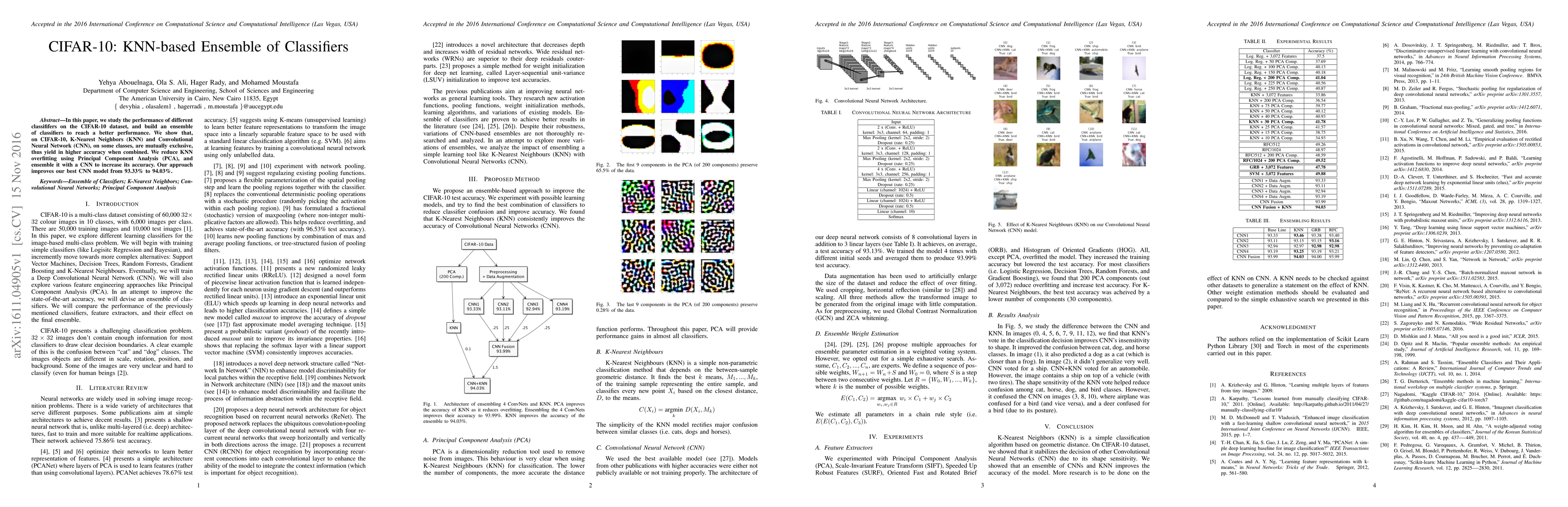 In this paper, we study the performance of different classifiers on the CIFAR-10 dataset, and build an ensemble of classifiers to reach a better performance. We show that, on CIFAR-10, K-Nearest Neighbors (KNN) and Convolutional Neural Network (CNN), on some classes, are mutually exclusive, thus yield in higher accuracy when combined. We reduce KNN overfitting using Principal Component Analysis (PCA), and ensemble it with a CNN to increase its accuracy. Our approach improves our best CNN model from 93.33% to 94.03%.