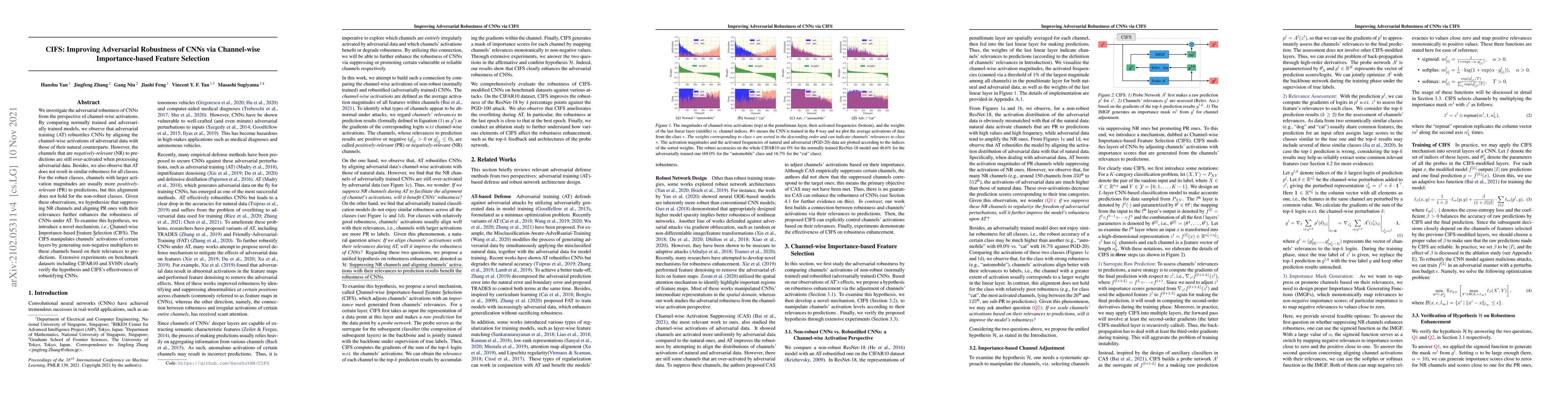 This paper proposes Channel-wise Importance-based Feature Selection (CIFS) to enhance the adversarial robustness of CNNs by suppressing negatively-relevant channels and aligning positively-relevant channels. Experiments show that CIFS effectively improves robustness on datasets like CIFAR10 and SVHN.