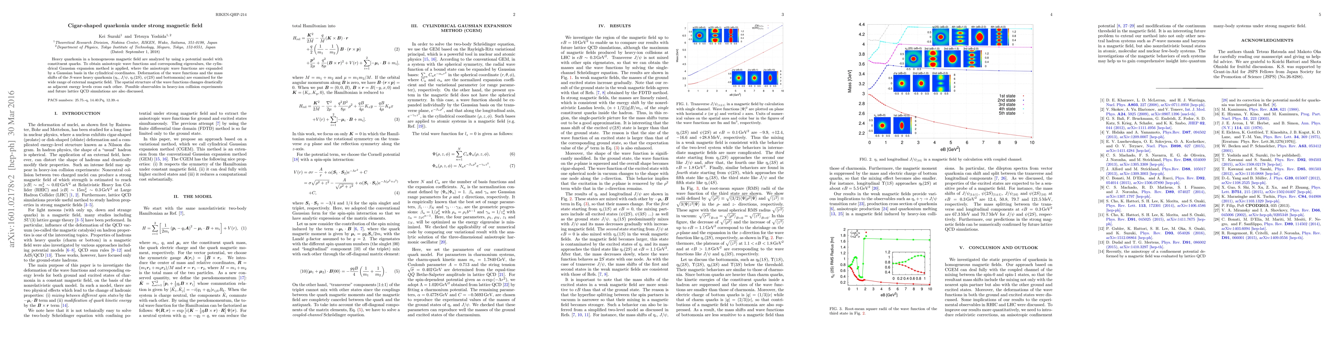 Heavy quarkonia in a homogeneous magnetic field are analyzed by using a potential model with constituent quarks. To obtain anisotropic wave functions and corresponding eigenvalues, the cylindrical Gaussian expansion method is applied, where the anisotropic wave functions are expanded by a Gaussian basis in the cylindrical coordinates. Deformation of the wave functions and the mass shifts of the $S$-wave heavy quarkonia ($\eta_c$, $J/\psi$, $\eta_c(2S)$, $\psi(2S)$ and bottomonia) are examined for the wide range of external magnetic field. The spatial structure of the wave functions changes drastically as adjacent energy levels cross each other. Possible observables in heavy-ion collision experiments and future lattice QCD simulations are also discussed.