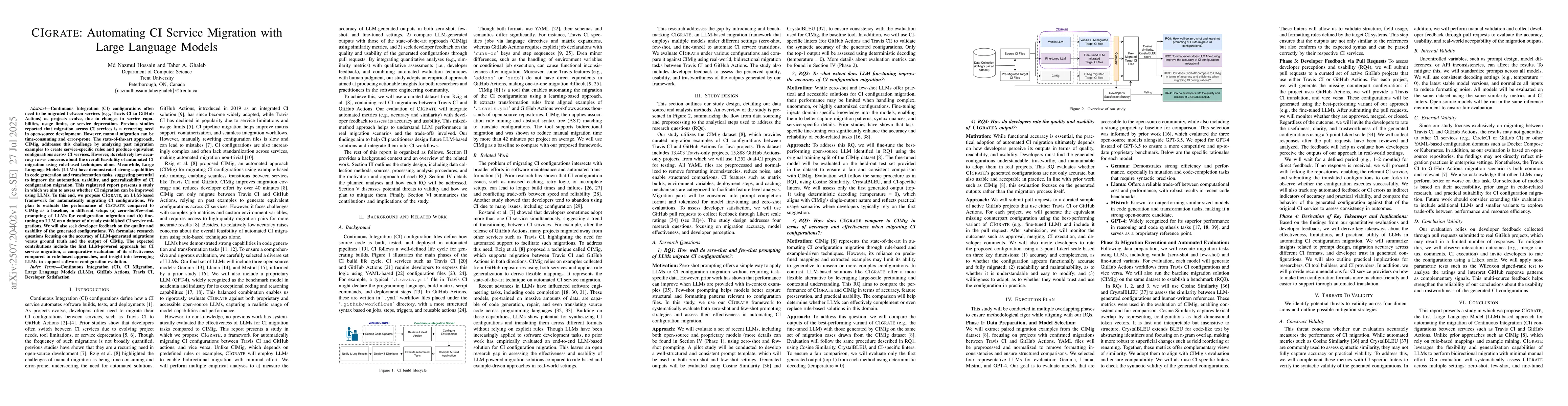 Continuous Integration (CI) configurations often need to be migrated between services (e.g., Travis CI to GitHub Actions) as projects evolve, due to changes in service capabilities, usage limits, or service deprecation. Previous studies reported that migration across CI services is a recurring need in open-source development. However, manual migration can be time-consuming and error-prone. The state-of-the-art approach, CIMig, addresses this challenge by analyzing past migration examples to create service-specific rules and produce equivalent configurations across CI services. However, its relatively low accuracy raises concerns about the overall feasibility of automated CI migration using rule-based techniques alone. Meanwhile, Large Language Models (LLMs) have demonstrated strong capabilities in code generation and transformation tasks, suggesting potential to improve the automation, usability, and generalizability of CI configuration migration. This registered report presents a study in which we aim to assess whether CI migration can be improved using LLMs. To this end, we propose CIgrate, an LLM-based framework for automatically migrating CI configurations. We plan to evaluate the performance of CIgrate compared to CIMig as a baseline, in different setups (a) zero-shot/few-shot prompting of LLMs for configuration migration and (b) fine-tuning an LLM on a dataset of already established CI service migrations. We will also seek developer feedback on the quality and usability of the generated configurations. We formulate research questions focusing on the accuracy of LLM-generated migrations versus ground truth and the output of CIMig. The expected contributions include the first LLM-powered approach for CI service migration, a comparative evaluation of its effectiveness compared to rule-based approaches, and insight into leveraging LLMs to support software configuration evolution.