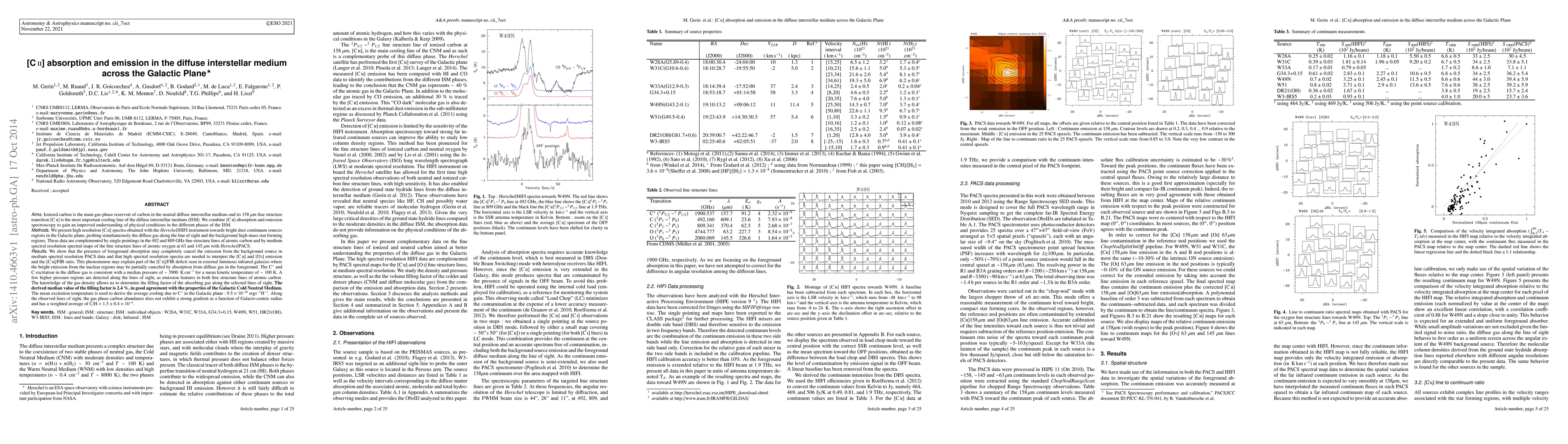 Ionized carbon is the main gas-phase reservoir of carbon in the neutral diffuse interstellar medium and its 158 micron fine structure transition [CII] is the most important cooling line of the diffuse interstellar medium (ISM). We combine [CII] absorption and emission spectroscopy to gain an improved understanding of physical conditions in the different phases of the ISM. We present high resolution [CII] spectra obtained with the Herschel/HIFI instrument towards bright dust continuum sources regions in the Galactic plane, probing simultaneously the diffuse gas along the line of sight and the background high-mass star forming regions. These data are complemented by observations of the 492 and 809 GHz fine structure lines of atomic carbon and by medium spectral resolution spectral maps of the fine structure lines of atomic oxygen at 63 and 145 microns with Herschel/PACS. We show that the presence of foreground absorption may completely cancel the emission from the background source in medium spectral resolution data and that high spectral resolution spectra are needed to interpret the [CII] and [OI] emission and the [CII]/FIR ratio. This phenomenon may explain part of the [CII]/FIR deficit seen in external luminous infrared galaxies. The C+ and C excitation in the diffuse gas is consistent with a median pressure of 5900 Kcm-3 for a mean TK ~100 K. The knowledge of the gas density allows us to determine the filling factor of the absorbing gas along the selected lines of sight: the median value is 2.4 %, in good agreement with the CNM properties. The mean excitation temperature is used to derive the average cooling due to C+ in the Galactic plane : 9.5 x 10^{-26} erg/s/H. Along the observed lines of sight, the gas phase carbon abundance does not exhibit a strong gradient as a function of Galacto-centric radius and has a weighted average of C/H = 1.5 +/- 0.4 x 10^{-4}.