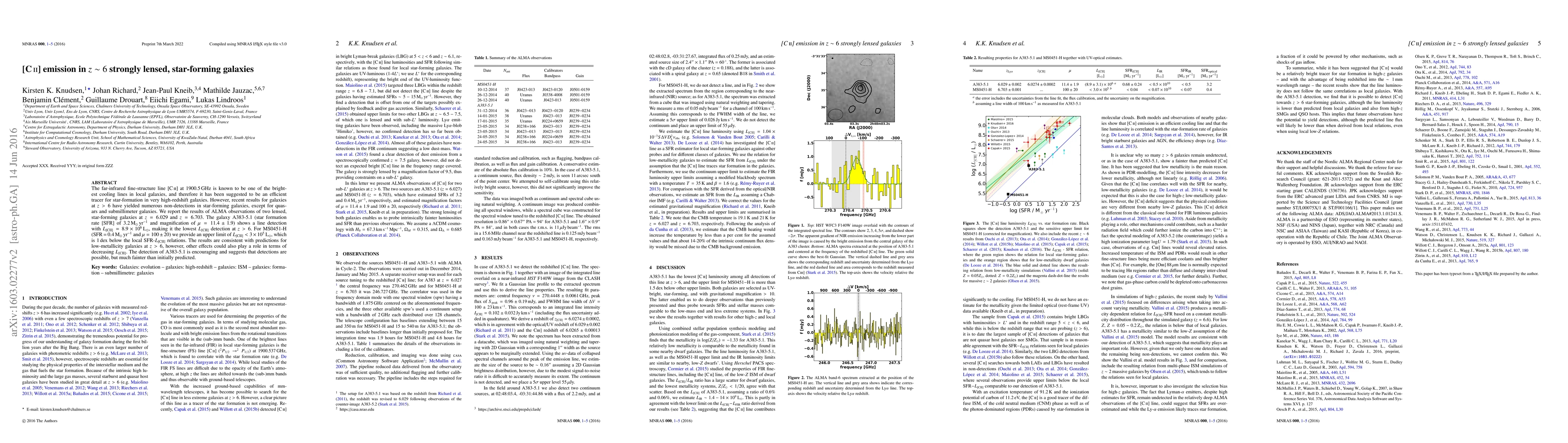 This paper reports ALMA observations of two strongly lensed, star-forming galaxies at $z \approx 6$, revealing a detection of the [CII] line in galaxy A383-5.1 and a non-detection in MS0451-H. The detection suggests that [CII] can trace star-formation in high-redshift galaxies, albeit at much lower luminosities than previously predicted.