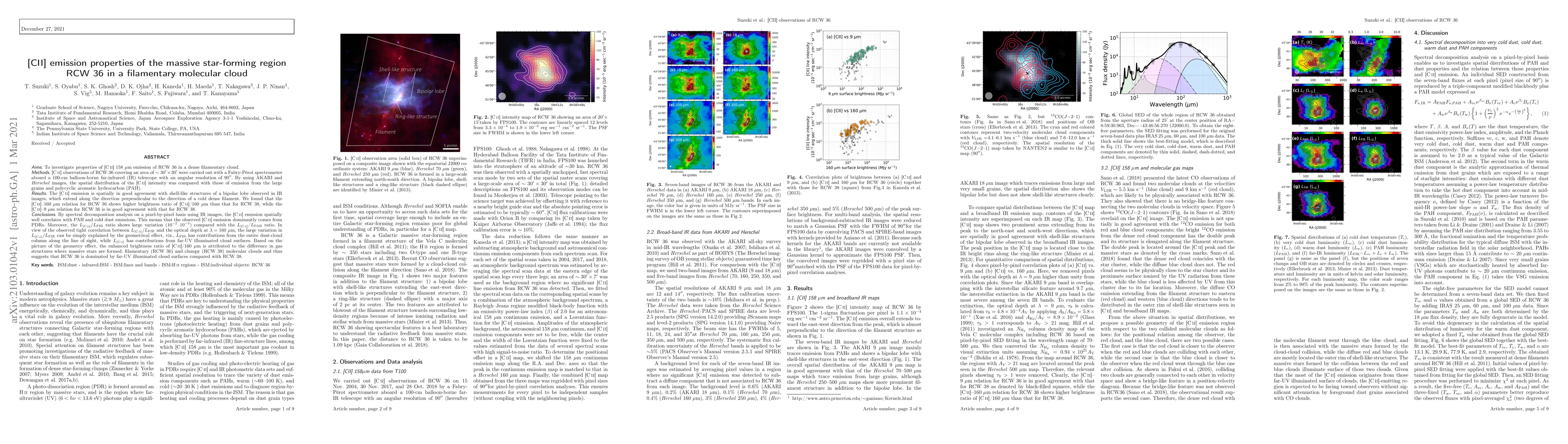 This study investigates [CII] emission in a massive star-forming region RCW36, finding it correlates with PAH and cold dust emissions and suggesting the presence of far-UV illuminated cloud surfaces.