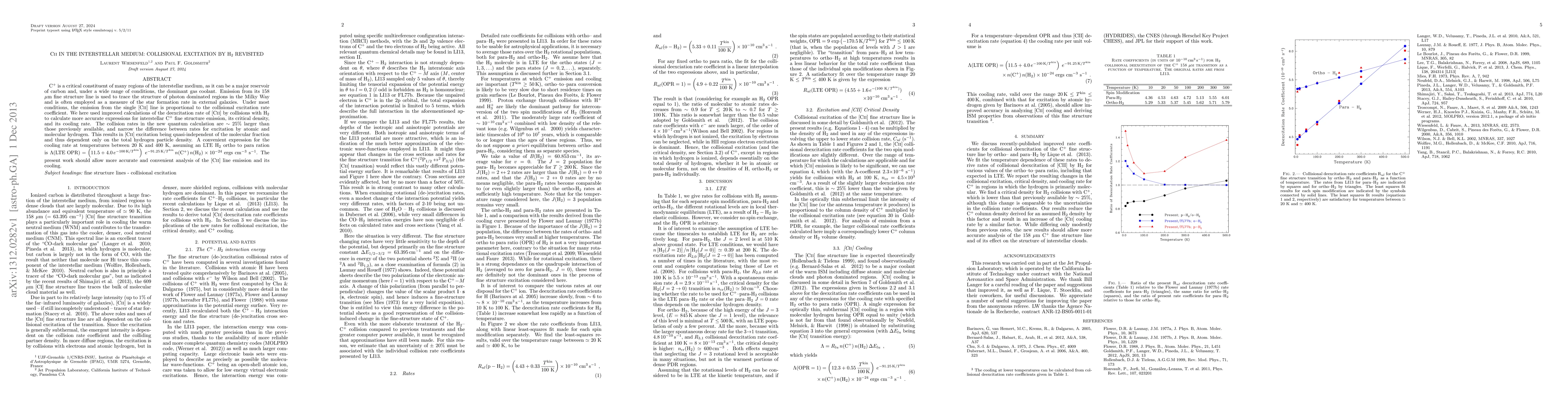 C$^+$ is a critical constituent of many regions of the interstellar medium, as it can be a major reservoir of carbon and, under a wide range of conditions, the dominant gas coolant. Emission from its 158$\mu$m fine structure line is used to trace the structure of photon dominated regions in the Milky Way and is often employed as a measure of the star formation rate in external galaxies. Under most conditions, the emission from the single [CII] line is proportional to the collisional excitation rate coefficient. We here used improved calculations of the deexcitation rate of [CII] by collisions with H$_2$ to calculate more accurate expressions for interstellar C$^+$ fine structure emission, its critical density, and its cooling rate. The collision rates in the new quantum calculation are $\sim$ 25% larger than those previously available, and narrow the difference between rates for excitation by atomic and molecular hydrogen. This results in [CII] excitation being quasi-independent of the molecular fraction and thus dependent only on the total hydrogen particle density. A convenient expression for the cooling rate at temperatures between 20 K and 400 K, assuming an LTE H$_2$ ortho to para ration is $\Lambda ({\rm LTE~OPR}) = \left(11.5 + 4.0\,e^{-100\,\mathrm K/T^{\rm kin}}\right)\;e^{-91.25\,\mathrm K/T^{\rm kin}}\,n ({\rm C}^{+})\,n({\rm H}_2)\times 10^{-24}\;{\rm ergs}~{\rm cm}^{-3}~{\rm s}^{-1}$. The present work should allow more accurate and convenient analysis of the [\CII] line emission and its cooling.