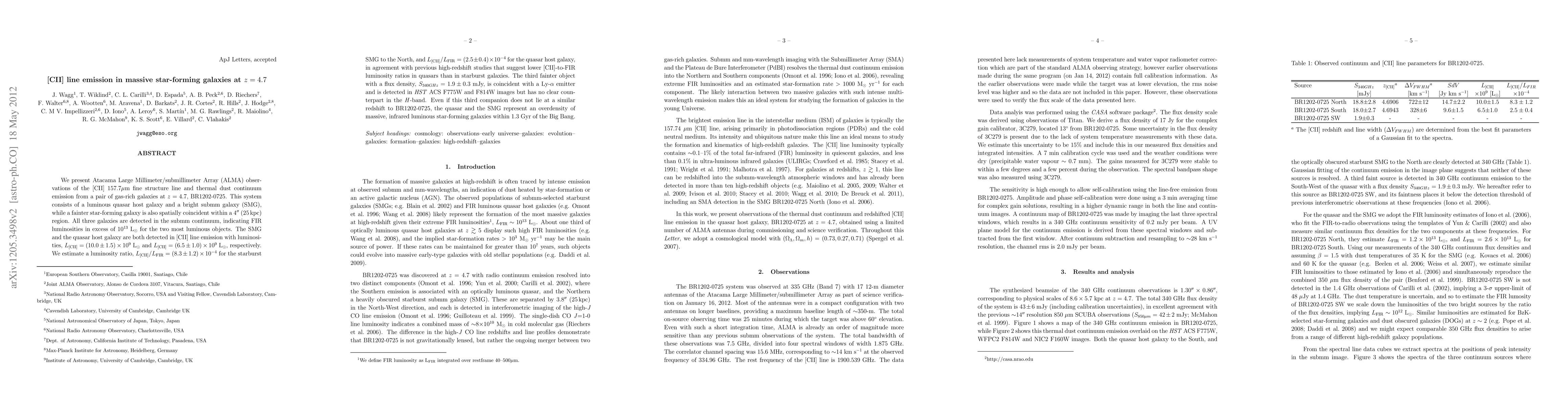 We present Atacama Large Millimeter/submillimeter Array (ALMA) observations of the [CII] 157.7micron fine structure line and thermal dust continuum emission from a pair of gas-rich galaxies at z=4.7, BR1202-0725. This system consists of a luminous quasar host galaxy and a bright submm galaxy (SMG), while a fainter star-forming galaxy is also spatially coincident within a 4" (25 kpc) region. All three galaxies are detected in the submm continuum, indicating FIR luminosities in excess of 10^13 Lsun for the two most luminous objects. The SMG and the quasar host galaxy are both detected in [CII] line emission with luminosities, L([CII]) = (10.0 +/- 1.5)x10^9 Lsun and L([CII]) = (6.5+/-1.0)x10^9 Lsun, respectively. We estimate a luminosity ratio, L([CII])/L(FIR) = (8.3+/-1.2)x10^-4 for the starburst SMG to the North, and L([CII])/L(FIR) = (2.5+/-0.4)x10^-4 for the quasar host galaxy, in agreement with previous high-redshift studies that suggest lower [CII]-to-FIR luminosity ratios in quasars than in starburst galaxies. The third fainter object with a flux density, S(340GHz) = 1.9+/-0.3 mJy, is coincident with a Ly-Alpha emitter and is detected in HST ACS F775W and F814W images but has no clear counterpart in the H-band. Even if this third companion does not lie at a similar redshift to BR1202-0725, the quasar and the SMG represent an overdensity of massive, infrared luminous star-forming galaxies within 1.3 Gyr of the Big Bang.