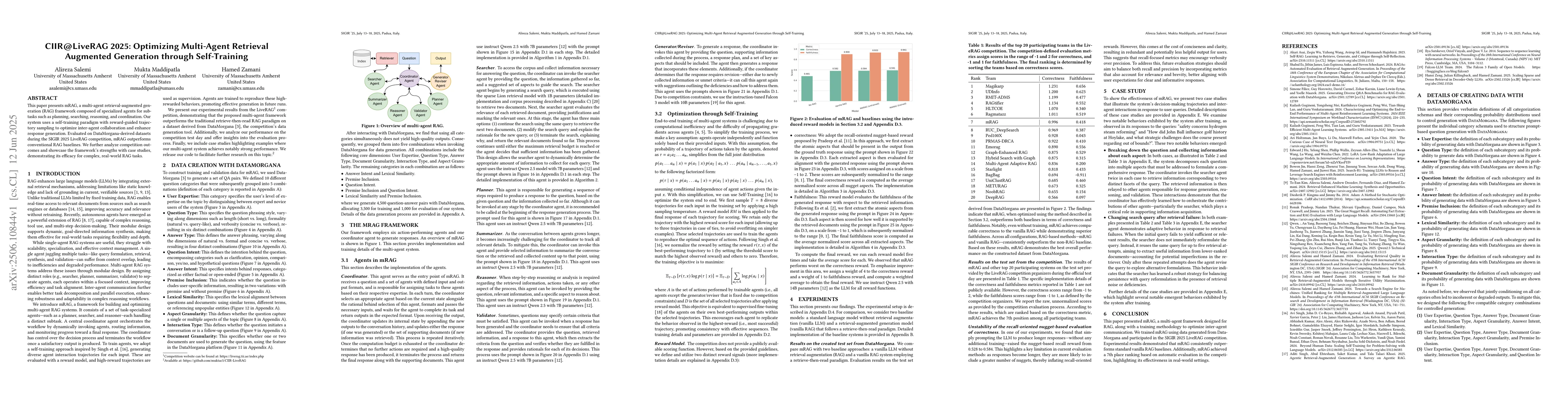 This paper presents mRAG, a multi-agent retrieval-augmented generation (RAG) framework composed of specialized agents for subtasks such as planning, searching, reasoning, and coordination. Our system uses a self-training paradigm with reward-guided trajectory sampling to optimize inter-agent collaboration and enhance response generation. Evaluated on DataMorgana-derived datasets during the SIGIR 2025 LiveRAG competition, mRAG outperforms conventional RAG baselines. We further analyze competition outcomes and showcase the framework's strengths with case studies, demonstrating its efficacy for complex, real-world RAG tasks.