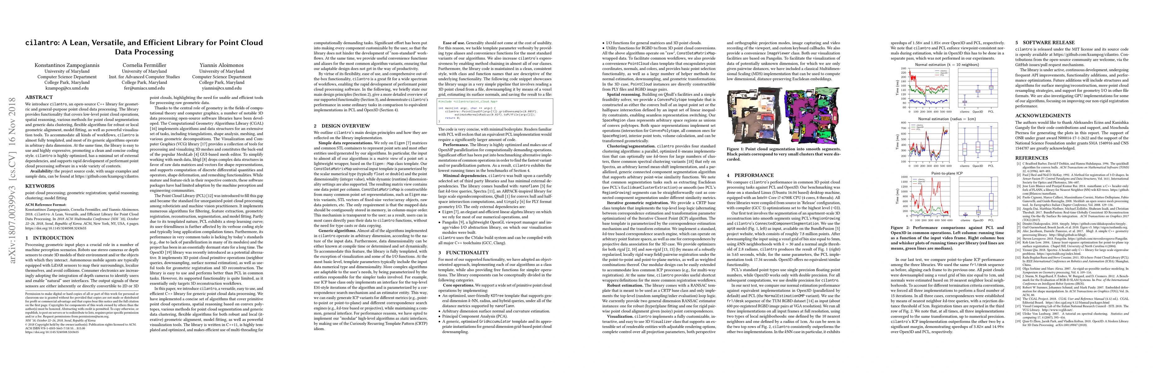 Cilantro is an open-source C++ library for efficient and versatile point cloud data processing, offering low-level operations, spatial reasoning, segmentation, clustering, alignment, model fitting, and visualization tools, while maintaining ease of use and minimal external dependencies. It is designed for rapid development of high-performance point cloud applications across various contexts.