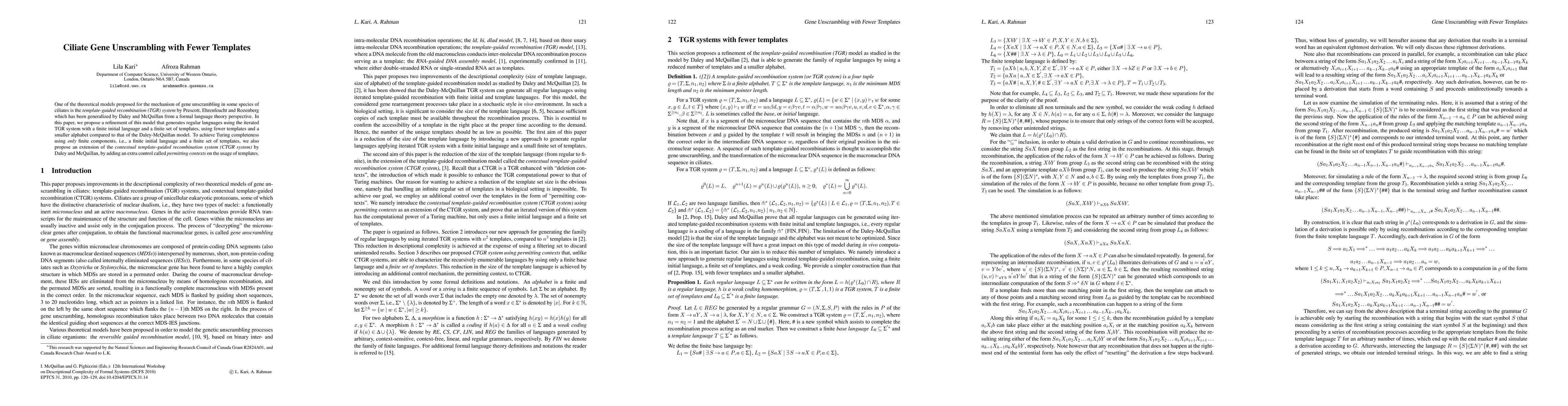 One of the theoretical models proposed for the mechanism of gene unscrambling in some species of ciliates is the template-guided recombination (TGR) system by Prescott, Ehrenfeucht and Rozenberg which has been generalized by Daley and McQuillan from a formal language theory perspective. In this paper, we propose a refinement of this model that generates regular languages using the iterated TGR system with a finite initial language and a finite set of templates, using fewer templates and a smaller alphabet compared to that of the Daley-McQuillan model. To achieve Turing completeness using only finite components, i.e., a finite initial language and a finite set of templates, we also propose an extension of the contextual template-guided recombination system (CTGR system) by Daley and McQuillan, by adding an extra control called permitting contexts on the usage of templates.