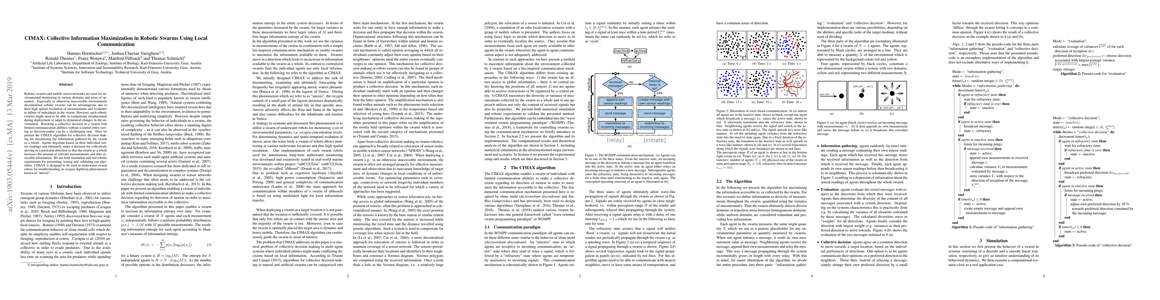 CIMAX is an algorithm for collective decision-making in robotic swarms, enabling decentralized negotiation among local agents to maximize information gathering. The algorithm was tested in simulations and real-world experiments, demonstrating its potential for underwater swarm robots to address environmental issues like "anoxia".