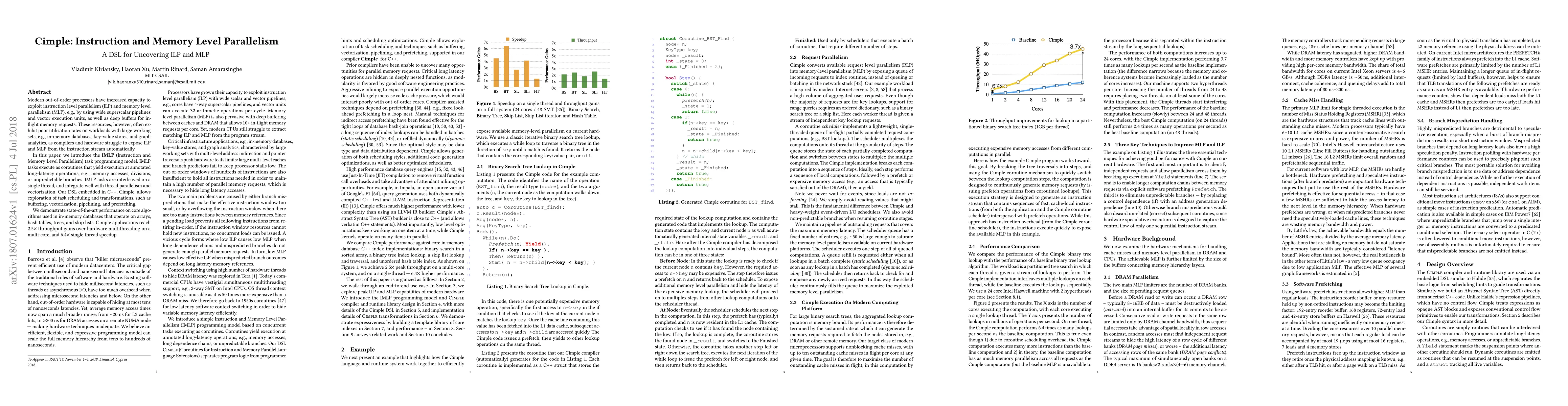 This paper introduces Cimple, a DSL embedded in C++ for exploring instruction and memory level parallelism, enabling better utilization of processor resources for workloads with large working sets. Cimple applications achieve significant performance gains, up to 2.5x over hardware multithreading on multi-core systems and 6.4x speedup in single-threaded scenarios.