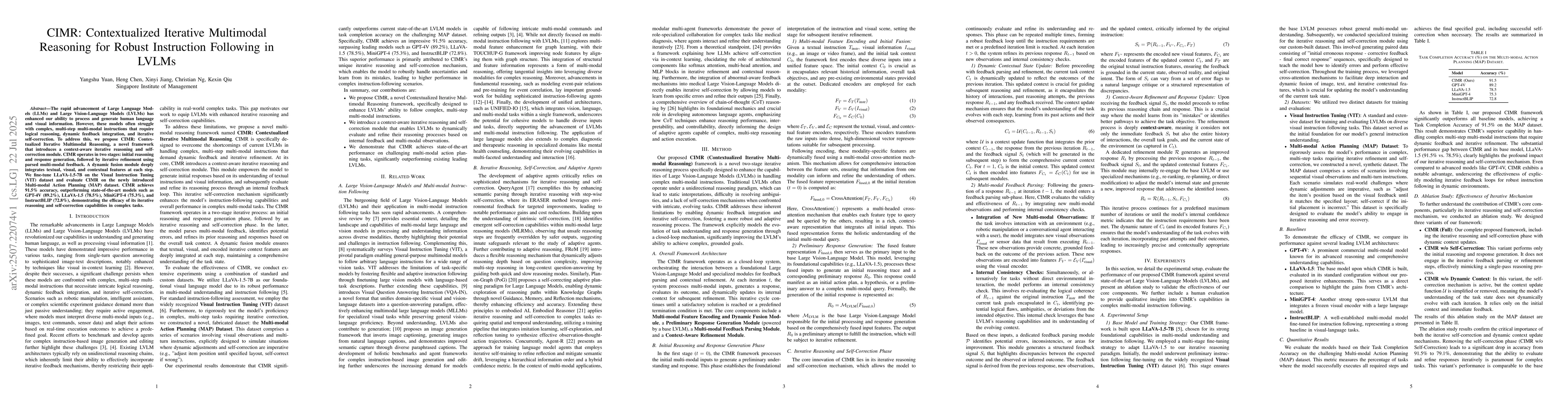 The rapid advancement of Large Language Models (LLMs) and Large Vision-Language Models (LVLMs) has enhanced our ability to process and generate human language and visual information. However, these models often struggle with complex, multi-step multi-modal instructions that require logical reasoning, dynamic feedback integration, and iterative self-correction. To address this, we propose CIMR: Contextualized Iterative Multimodal Reasoning, a novel framework that introduces a context-aware iterative reasoning and self-correction module. CIMR operates in two stages: initial reasoning and response generation, followed by iterative refinement using parsed multi-modal feedback. A dynamic fusion module deeply integrates textual, visual, and contextual features at each step. We fine-tune LLaVA-1.5-7B on the Visual Instruction Tuning (VIT) dataset and evaluate CIMR on the newly introduced Multi-modal Action Planning (MAP) dataset. CIMR achieves 91.5% accuracy, outperforming state-of-the-art models such as GPT-4V (89.2%), LLaVA-1.5 (78.5%), MiniGPT-4 (75.3%), and InstructBLIP (72.8%), demonstrating the efficacy of its iterative reasoning and self-correction capabilities in complex tasks.