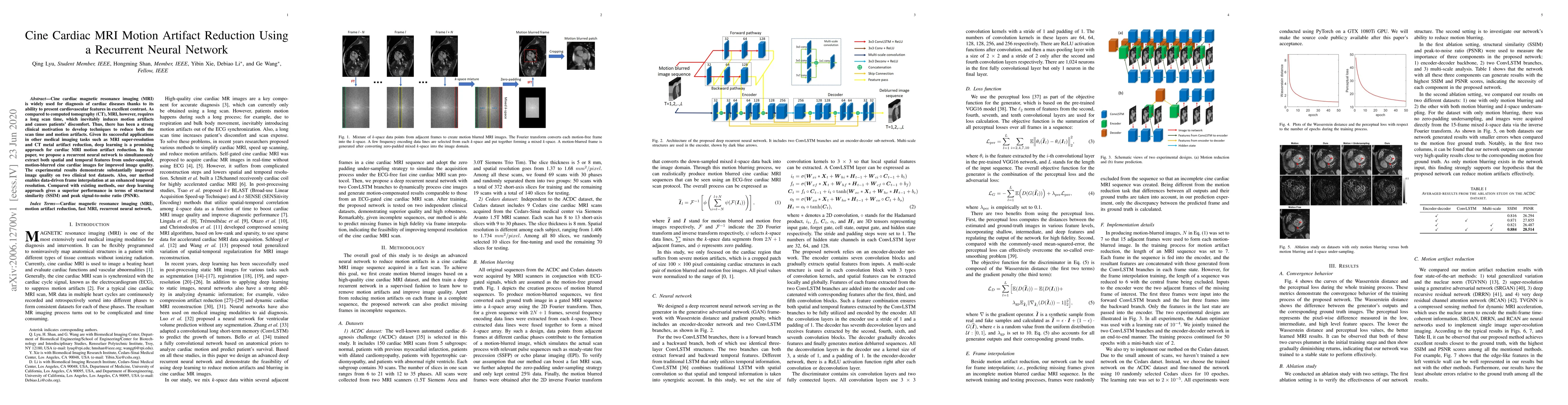 This paper proposes a recurrent neural network to reduce motion artifacts in cine cardiac MRI, enhancing image quality by extracting spatial and temporal features from under-sampled images. The method significantly improves structural similarity and peak signal-to-noise ratio compared to existing techniques, enabling better frame interpolation at higher temporal resolution.