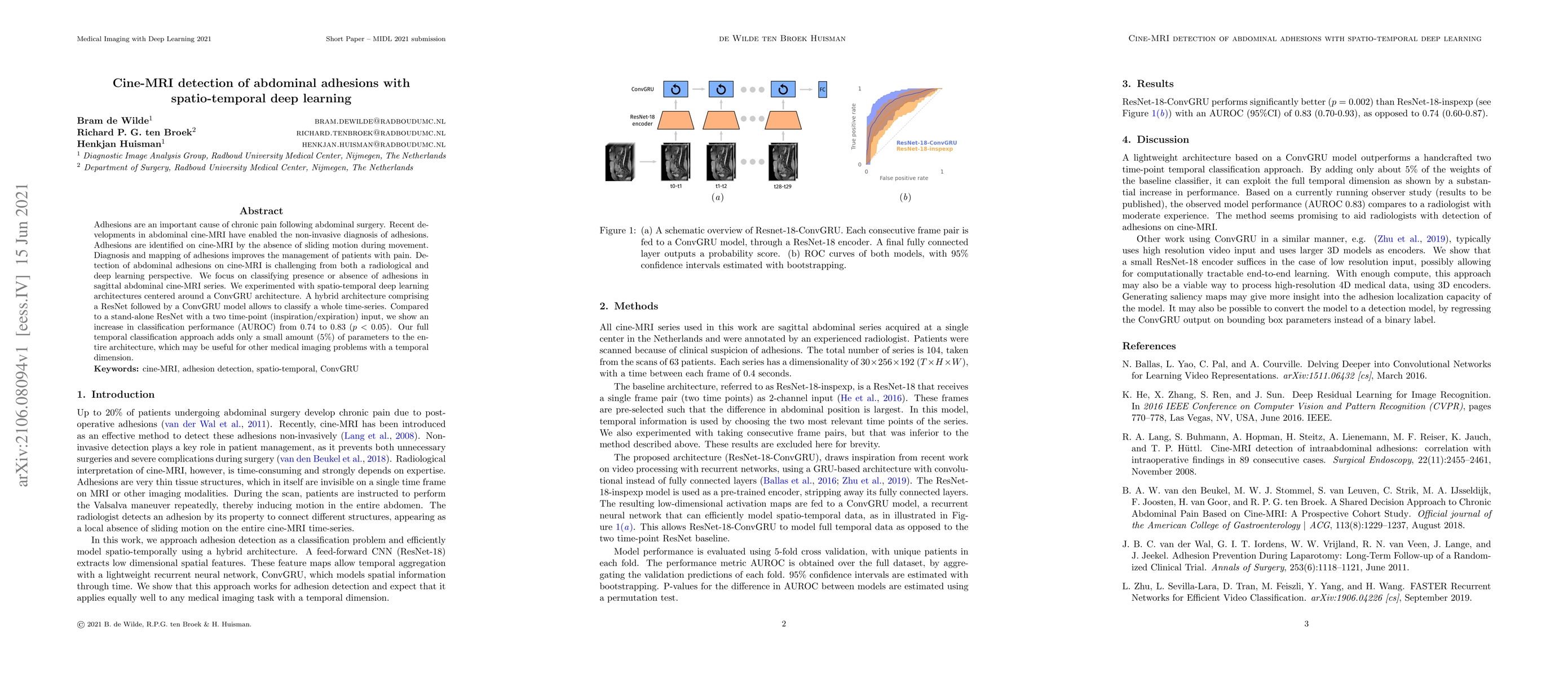 This study employs a hybrid spatio-temporal deep learning model combining ResNet and ConvGRU to improve the detection of abdominal adhesions in cine-MRI. The proposed method enhances classification performance compared to using a standalone ResNet, indicating potential benefits for managing chronic pain post-surgery.