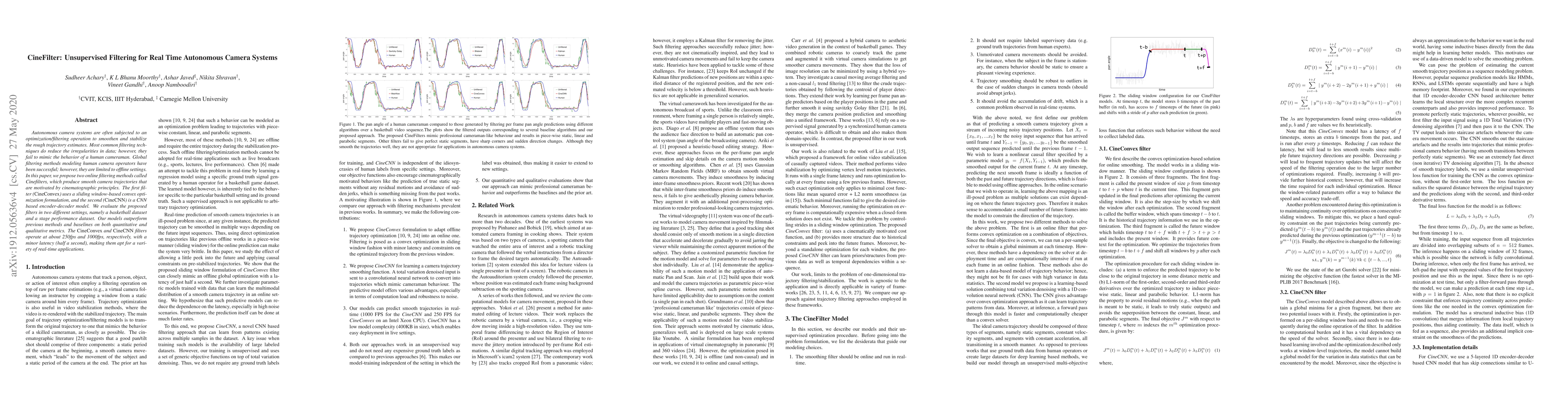 Autonomous camera systems are often subjected to an optimization/filtering operation to smoothen and stabilize the rough trajectory estimates. Most common filtering techniques do reduce the irregularities in data; however, they fail to mimic the behavior of a human cameraman. Global filtering methods modeling human camera operators have been successful; however, they are limited to offline settings. In this paper, we propose two online filtering methods called Cinefilters, which produce smooth camera trajectories that are motivated by cinematographic principles. The first filter (CineConvex) uses a sliding window-based convex optimization formulation, and the second (CineCNN) is a CNN based encoder-decoder model. We evaluate the proposed filters in two different settings, namely a basketball dataset and a stage performance dataset. Our models outperform previous methods and baselines on both quantitative and qualitative metrics. The CineConvex and CineCNN filters operate at about 250fps and 1000fps, respectively, with a minor latency (half a second), making them apt for a variety of real-time applications.