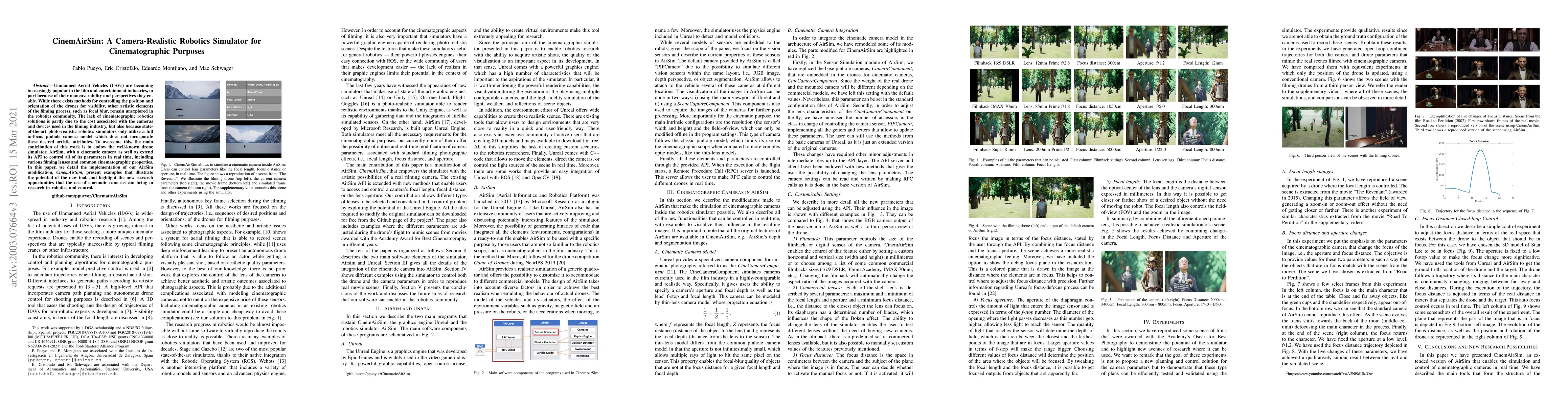 CinemAirSim enhances the drone simulator AirSim by incorporating a camera-realistic model that includes cinematic elements like focal blur and light control, enabling more artistic control over drone cinematography. This modification opens new avenues for robotics research by allowing real-time simulation of cinematographic properties.