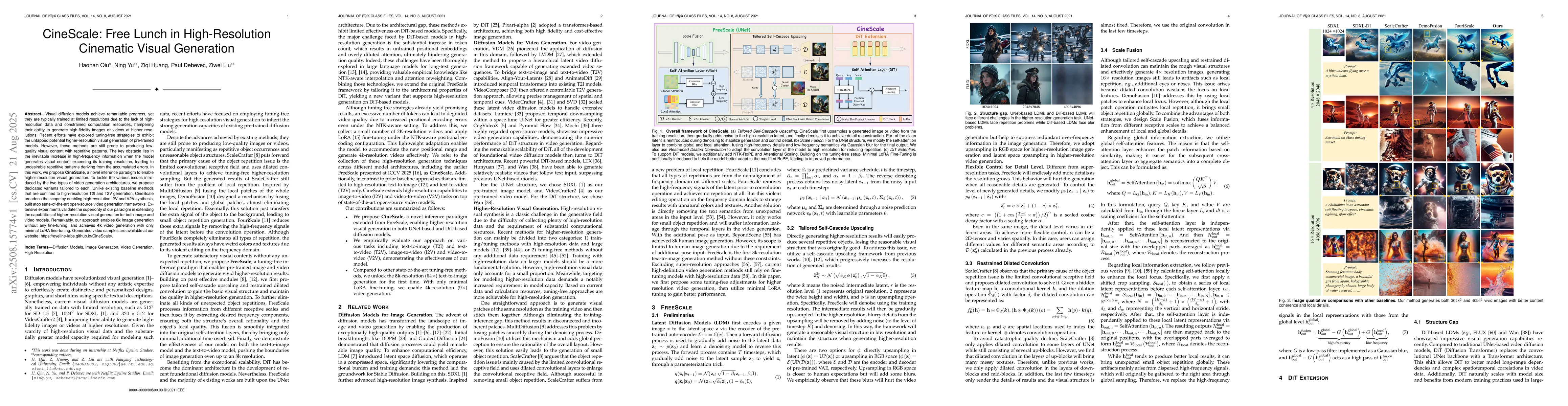 Visual diffusion models achieve remarkable progress, yet they are typically trained at limited resolutions due to the lack of high-resolution data and constrained computation resources, hampering their ability to generate high-fidelity images or videos at higher resolutions. Recent efforts have explored tuning-free strategies to exhibit the untapped potential higher-resolution visual generation of pre-trained models. However, these methods are still prone to producing low-quality visual content with repetitive patterns. The key obstacle lies in the inevitable increase in high-frequency information when the model generates visual content exceeding its training resolution, leading to undesirable repetitive patterns deriving from the accumulated errors. In this work, we propose CineScale, a novel inference paradigm to enable higher-resolution visual generation. To tackle the various issues introduced by the two types of video generation architectures, we propose dedicated variants tailored to each. Unlike existing baseline methods that are confined to high-resolution T2I and T2V generation, CineScale broadens the scope by enabling high-resolution I2V and V2V synthesis, built atop state-of-the-art open-source video generation frameworks. Extensive experiments validate the superiority of our paradigm in extending the capabilities of higher-resolution visual generation for both image and video models. Remarkably, our approach enables 8k image generation without any fine-tuning, and achieves 4k video generation with only minimal LoRA fine-tuning. Generated video samples are available at our website: https://eyeline-labs.github.io/CineScale/.