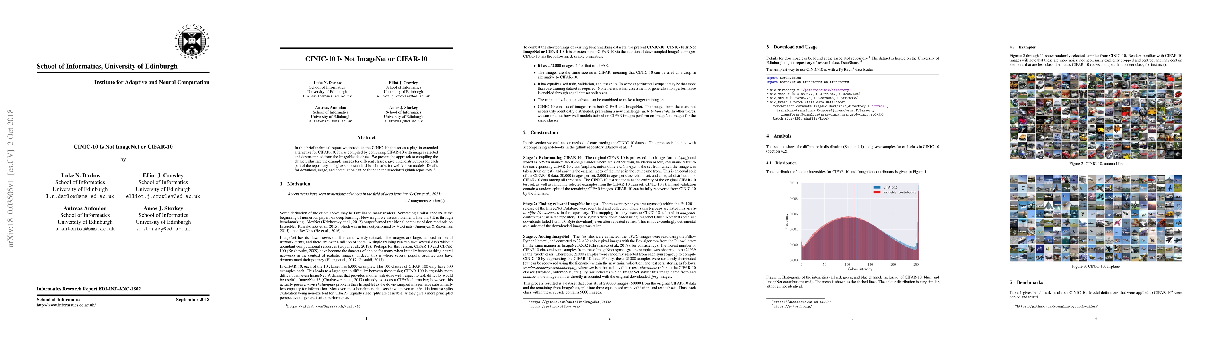 In this brief technical report we introduce the CINIC-10 dataset as a plug-in extended alternative for CIFAR-10. It was compiled by combining CIFAR-10 with images selected and downsampled from the ImageNet database. We present the approach to compiling the dataset, illustrate the example images for different classes, give pixel distributions for each part of the repository, and give some standard benchmarks for well known models. Details for download, usage, and compilation can be found in the associated github repository.