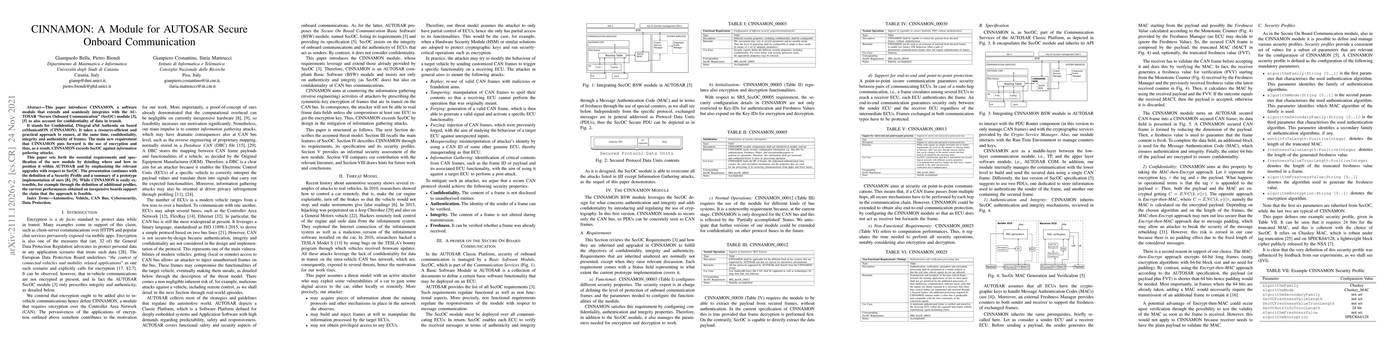 This paper introduces CINNAMON, a software module that extends and seamlessly integrates with the AUTOSAR "Secure Onboard Communication" (SecOC) module to also account for confidentiality of data in transit. It stands for Confidential, INtegral aNd Authentic on board coMunicatiON (CINNAMON). It takes a resource-efficient and practical approach to ensure, at the same time, confidentiality, integrity and authenticity of frames. The main new requirement that CINNAMON puts forward is the use of encryption and thus, as a result, CINNAMON exceeds SecOC against information gathering attacks. This paper sets forth the essential requirements and specification of the new module by detailing where and how to position it within AUTOSAR and by emphasizing the relevant upgrades with respect to SecOC. The presentation continues with the definition of a Security Profile and a summary of a prototype implementation of ours. While CINNAMON is easily extensible, for example through the definition of additional profiles, the current performances obtained on inexpensive boards support the claim that the approach is feasible.
