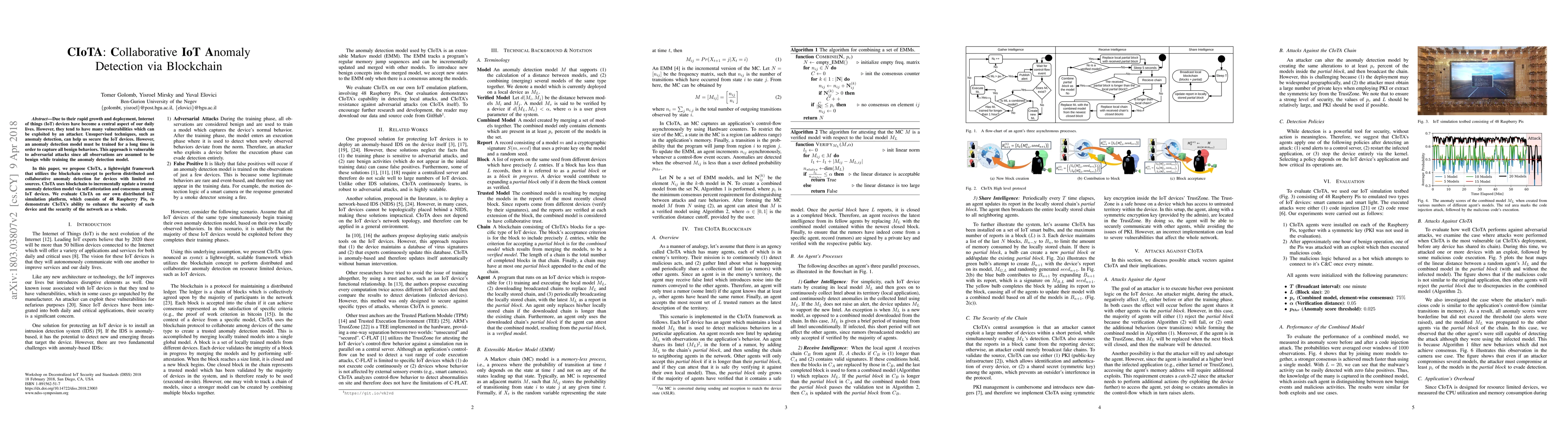 Due to their rapid growth and deployment, Internet of things (IoT) devices have become a central aspect of our daily lives. However, they tend to have many vulnerabilities which can be exploited by an attacker. Unsupervised techniques, such as anomaly detection, can help us secure the IoT devices. However, an anomaly detection model must be trained for a long time in order to capture all benign behaviors. This approach is vulnerable to adversarial attacks since all observations are assumed to be benign while training the anomaly detection model. In this paper, we propose CIoTA, a lightweight framework that utilizes the blockchain concept to perform distributed and collaborative anomaly detection for devices with limited resources. CIoTA uses blockchain to incrementally update a trusted anomaly detection model via self-attestation and consensus among IoT devices. We evaluate CIoTA on our own distributed IoT simulation platform, which consists of 48 Raspberry Pis, to demonstrate CIoTA's ability to enhance the security of each device and the security of the network as a whole.