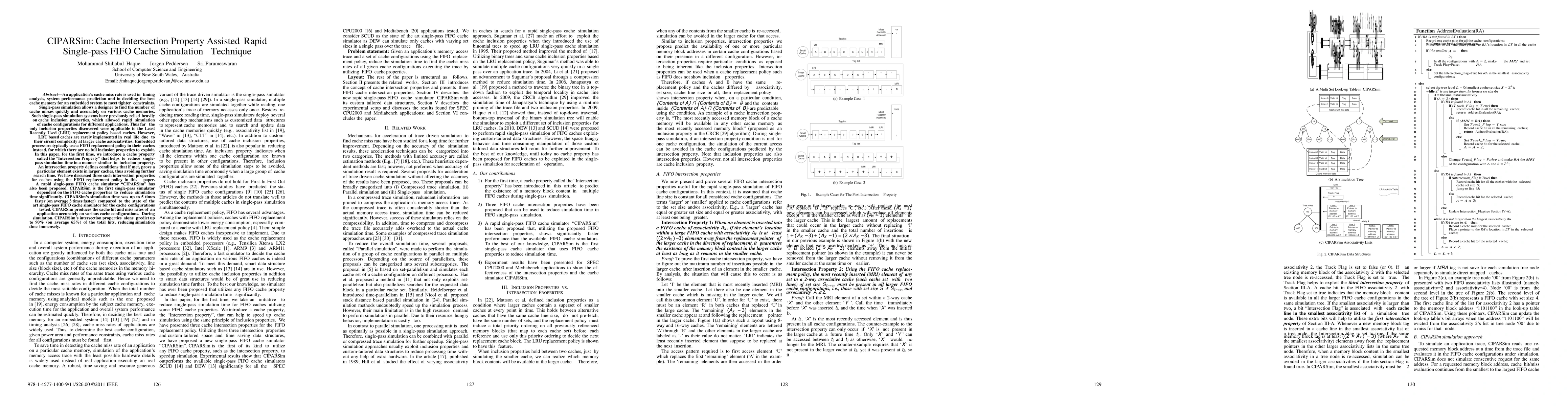 In this paper, for the first time, we introduce a cache property called the Intersection Property that helps to reduce singlepass simulation time in a manner similar to inclusion property. An intersection property defines conditions that if met, prove a particular element exists in larger caches, thus avoiding further search time. We have discussed three such intersection properties for caches using the FIFO replacement policy in this paper. A rapid singlepass FIFO cache simulator CIPARSim has also been proposed. CIPARSim is the first singlepass simulator dependent on the FIFO cache properties to reduce simulation time significantly. CIPARSim simulation time was up to 5 times faster compared to the state of the art singlepass FIFO cache simulator for the cache configurations tested. CIPARSim produces the cache hit and miss rates of an application accurately on various cache configurations. During simulation, CIPARSim intersection properties alone predict up to 90% of the total hits, reducing simulationtime immensely