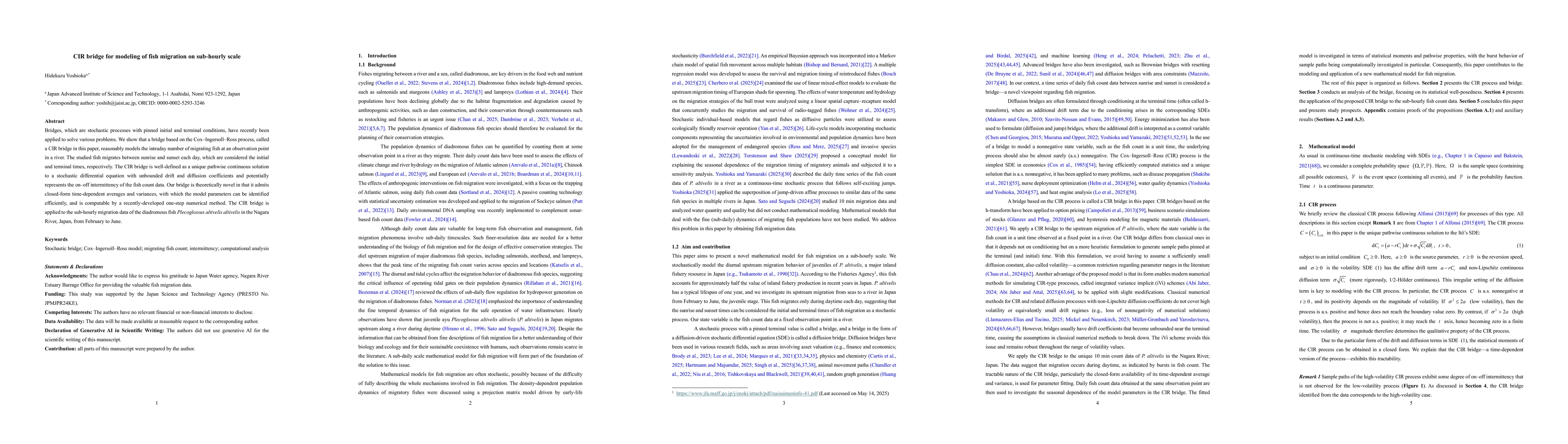 Bridges, which are stochastic processes with pinned initial and terminal conditions, have recently been applied to solve various problems. We show that a bridge based on the Cox-Ingersoll-Ross process, called a CIR bridge in this paper, reasonably models the intraday number of migrating fish at an observation point in a river. The studied fish migrates between sunrise and sunset each day, which are considered the initial and terminal times, respectively. The CIR bridge is well-defined as a unique pathwise continuous solution to a stochastic differential equation with unbounded drift and diffusion coefficients and potentially represents the on-off intermittency of the fish count data. Our bridge is theoretically novel in that it admits closed-form time-dependent averages and variances, with which the model parameters can be identified efficiently, and is computable by a recently-developed one-step numerical method. The CIR bridge is applied to the sub-hourly migration data of the diadromous fish Plecoglossus altivelis altivelis in the Nagara River, Japan, from February to June.
