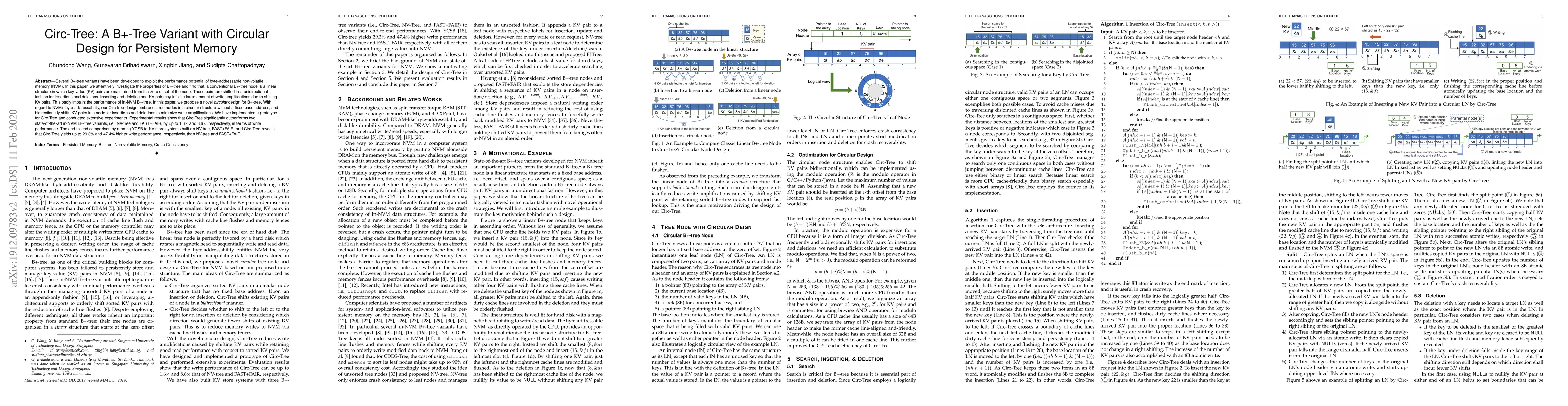 This paper proposes Circ-Tree, a circular B+-tree variant designed to minimize write amplifications for persistent memory systems. Unlike linear B+-trees, Circ-Tree's circular node structure and bidirectional key-value pair shifts significantly outperform existing NVM B+-tree variants, achieving up to 1.6x and 8.6x better write performance compared to NV-tree and FAST+FAIR, respectively.