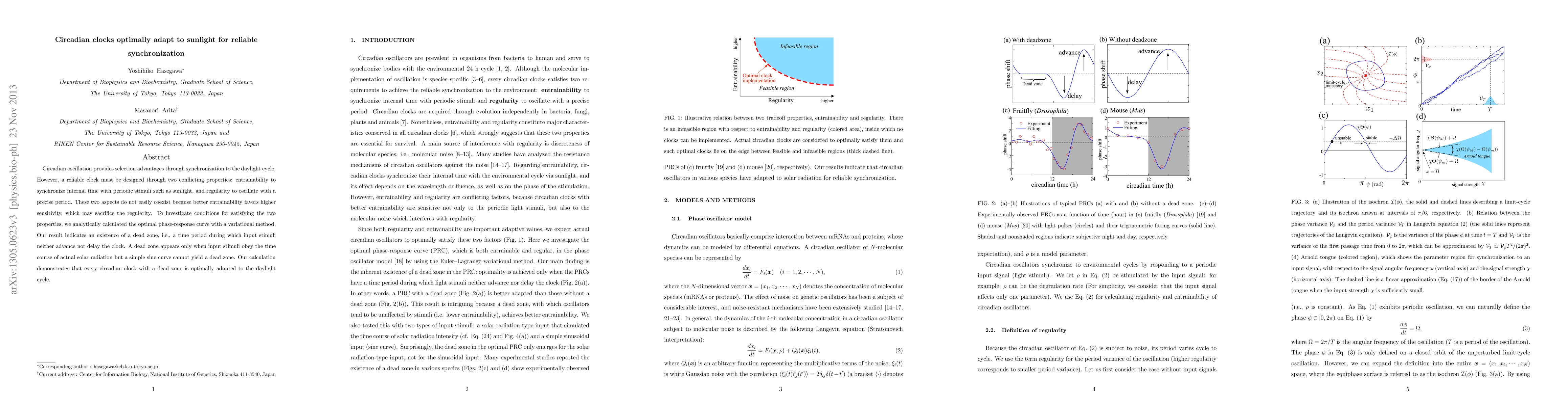 Circadian oscillation provides selection advantages through synchronization to the daylight cycle. However, a reliable clock must be designed through two conflicting properties: entrainability to synchronize internal time with periodic stimuli such as sunlight, and regularity to oscillate with a precise period. These two aspects do not easily coexist because better entrainability favors higher sensitivity, which may sacrifice the regularity. To investigate conditions for satisfying the two properties, we analytically calculated the optimal phase-response curve with a variational method. Our result indicates an existence of a dead zone, i.e., a time period during which input stimuli neither advance nor delay the clock. A dead zone appears only when input stimuli obey the time course of actual solar radiation but a simple sine curve cannot yield a dead zone. Our calculation demonstrates that every circadian clock with a dead zone is optimally adapted to the daylight cycle.