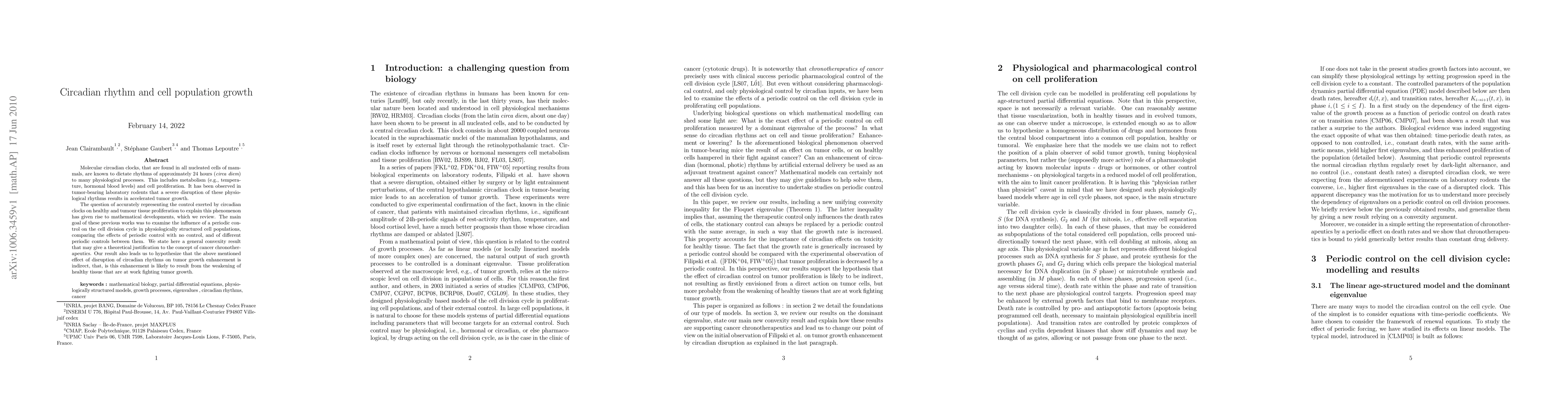 Molecular circadian clocks, that are found in all nucleated cells of mammals, are known to dictate rhythms of approximately 24 hours (circa diem) to many physiological processes. This includes metabolism (e.g., temperature, hormonal blood levels) and cell proliferation. It has been observed in tumor-bearing laboratory rodents that a severe disruption of these physiological rhythms results in accelerated tumor growth. The question of accurately representing the control exerted by circadian clocks on healthy and tumour tissue proliferation to explain this phenomenon has given rise to mathematical developments, which we review. The main goal of these previous works was to examine the influence of a periodic control on the cell division cycle in physiologically structured cell populations, comparing the effects of periodic control with no control, and of different periodic controls between them. We state here a general convexity result that may give a theoretical justification to the concept of cancer chronotherapeutics. Our result also leads us to hypothesize that the above mentioned effect of disruption of circadian rhythms on tumor growth enhancement is indirect, that, is this enhancement is likely to result from the weakening of healthy tissue that are at work fighting tumor growth.
