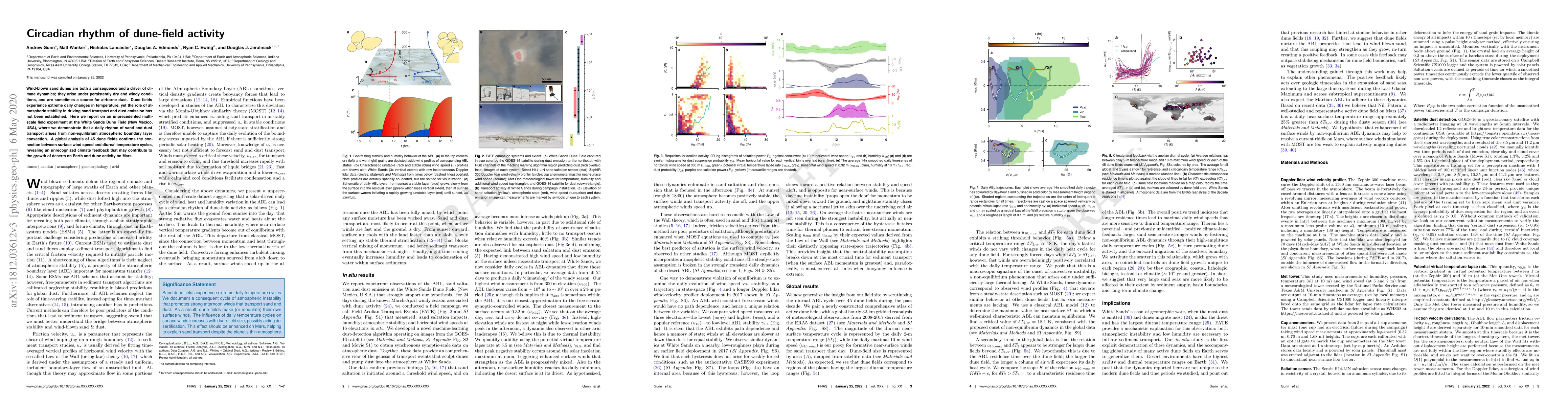 This study reveals that dune-field activity exhibits a daily rhythm driven by non-equilibrium atmospheric boundary layer convection, with a global analysis confirming the link between surface wind speed and diurnal temperature cycles. This unrecognized climate feedback may influence desert growth and dune activity on Earth and Mars.