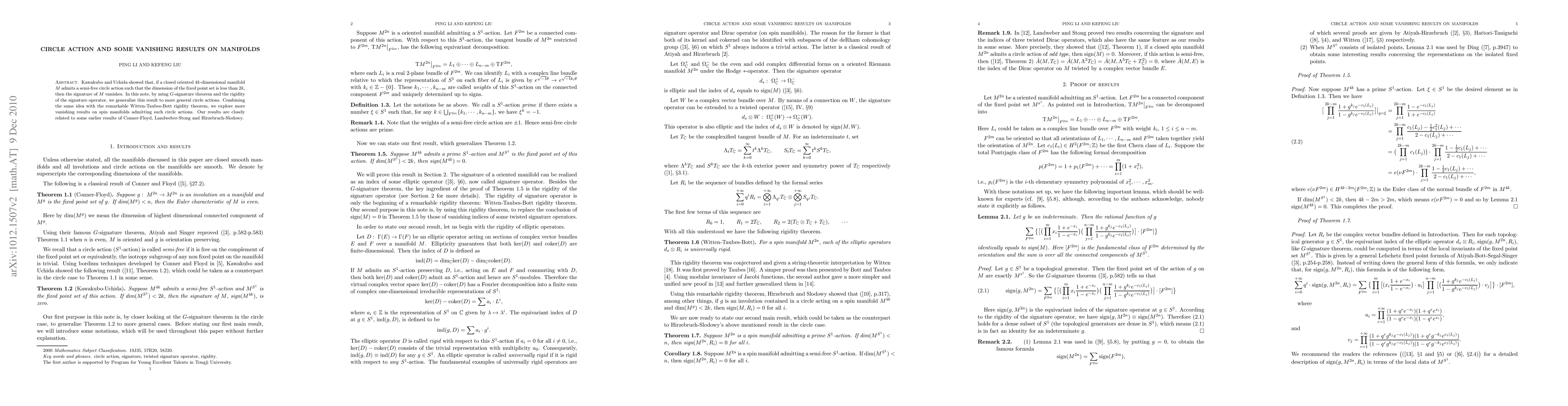Kawakubo and Uchida showed that, if a closed oriented $4k$-dimensional manifold $M$ admits a semi-free circle action such that the dimension of the fixed point set is less than $2k$, then the signature of $M$ vanishes. In this note, by using $G$-signature theorem and the rigidity of the signature operator, we generalize this result to more general circle actions. Combining the same idea with the remarkable Witten-Taubes-Bott rigidity theorem, we explore more vanishing results on spin manifolds admitting such circle actions. Our results are closely related to some earlier results of Conner-Floyd, Landweber-Stong and Hirzebruch-Slodowy.