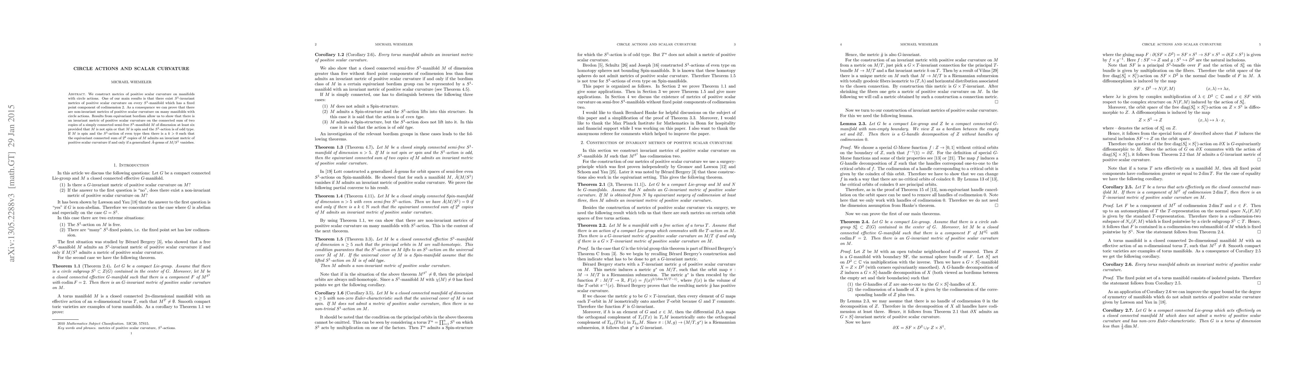 We construct metrics of positive scalar curvature on manifolds with circle actions. One of our main results is that there exist $S^1$-invariant metrics of positive scalar curvature on every $S^1$-manifold which has a fixed point component of codimension 2. As a consequence we can prove that there are non-invariant metrics of positive scalar curvature on many manifolds with circle actions. Results from equivariant bordism allow us to show that there is an invariant metric of positive scalar curvature on the connected sum of two copies of a simply connected semi-free $S^1$-manifold $M$ of dimension at least six provided that $M$ is not $\text{spin}$ or that $M$ is $\text{spin}$ and the $S^1$-action is of odd type. If $M$ is spin and the $S^1$-action of even type then there is a $k>0$ such that the equivariant connected sum of $2^k$ copies of $M$ admits an invariant metric of positive scalar curvature if and only if a generalized $\hat{A}$-genus of $M/S^1$ vanishes.