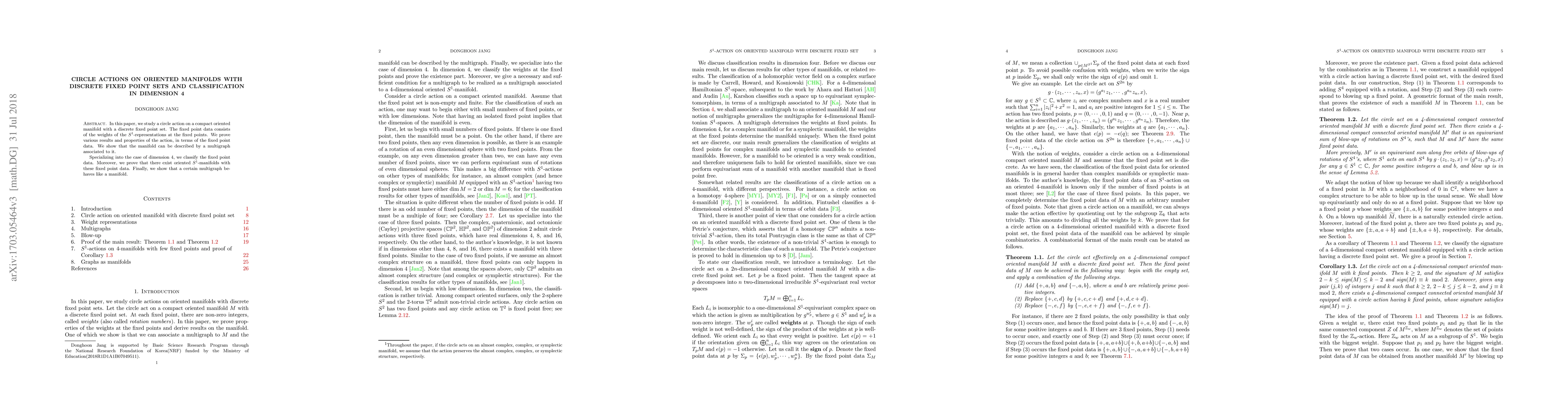 This paper investigates circle actions on compact oriented manifolds with discrete fixed point sets, focusing on the fixed point data represented by $S^1$-representations. It classifies such actions in dimension 4, showing that the manifold can be described by an associated multigraph and proving the existence of oriented $S^1$-manifolds with these fixed point data.